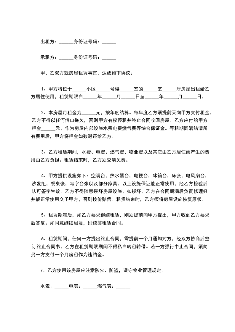 第七条 1、租赁期间,双方均不得无故解除合同,任何一方提出解除合同,需提前 天通知对方,经双方协商一致后终止合同,租赁期间甲方擅自解除合同的应赔偿乙方。