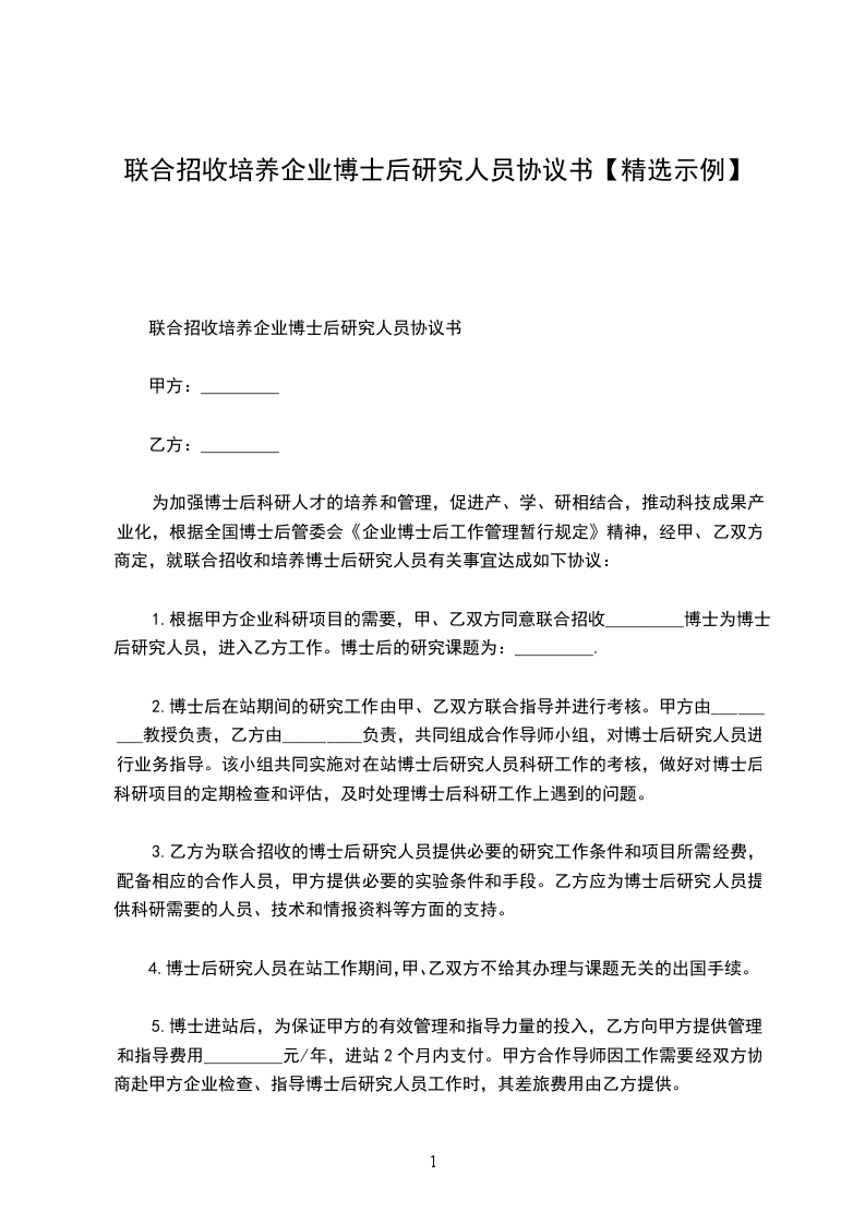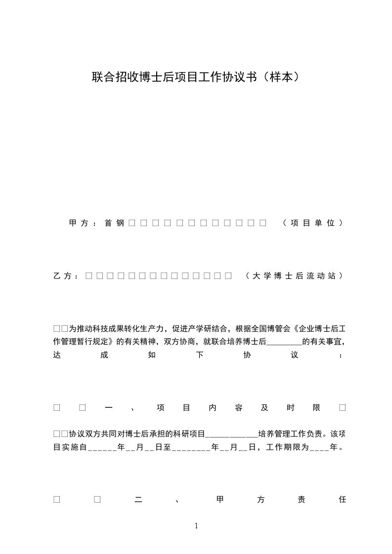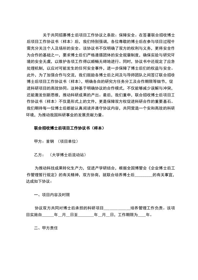 为推动科技成果转化生产力,促进产学研结合,根据全国博管会《企业博士后工作管理暂行规定》的有关精神,双方协商,就联合培养博士后_________的有关事宜,达成如下协议: