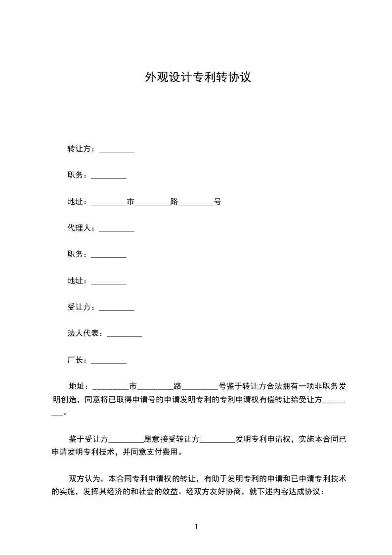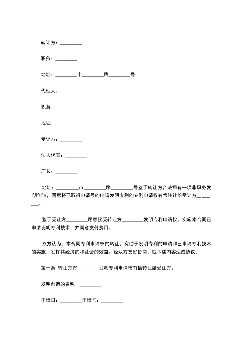 地址:_________市_________路_________号鉴于转让方合法拥有一项非职务发明创造,同意将已取得申请号的申请发明专利的专利申请权有偿转让给受让方_________。