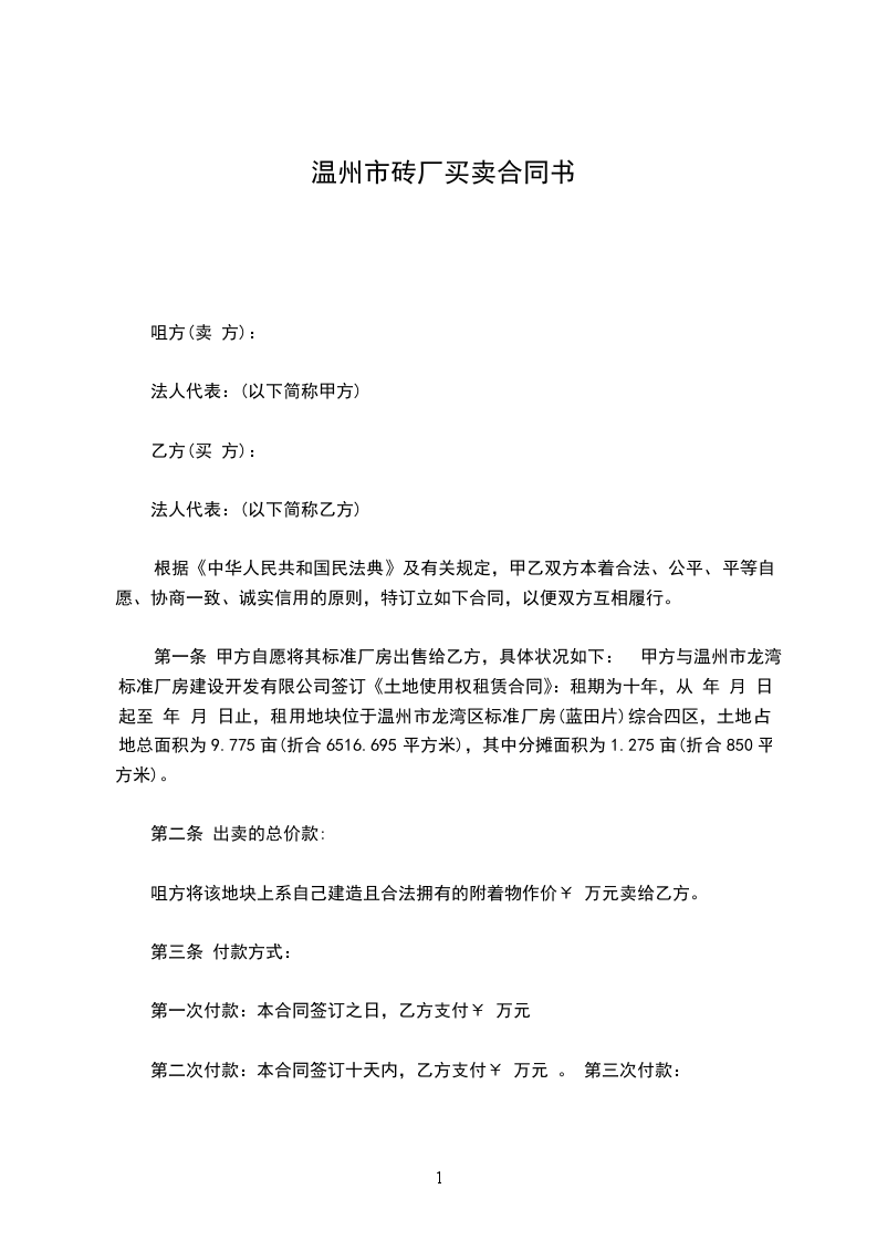 第一条 甲方自愿将其标准厂房出售给乙方,具体状况如下: 甲方与温州市龙湾标准厂房建设开发有限公司签订《土地使用权租赁合同》:租期为十年,从 年 月 日起至 年 月 日止,租用地块位于温州市龙湾区标准厂房(蓝田片)综合四区,土地占地总面积为9.775亩(折合6516.695平方米),其中分摊面积为1.275亩(折合850平方米)。