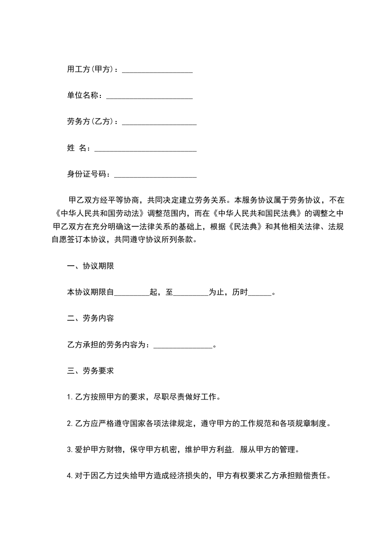 甲乙双方经平等协商,共同决定建立劳务关系。本服务协议属于劳务协议,不在《中华人民共和国劳动法》调整范围内,而在《中华人民共和国民法典》的调整之中。甲乙双方在充分明确这一法律关系的基础上,根据《民法典》和其他相关法律、法规,自愿签订本协议,共同遵守协议所列条款。
