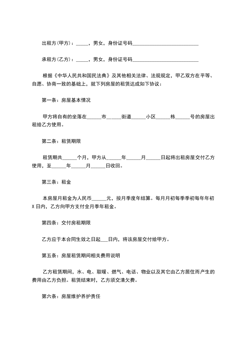 承租方(乙方):_____,男女,身份证号码___________________________