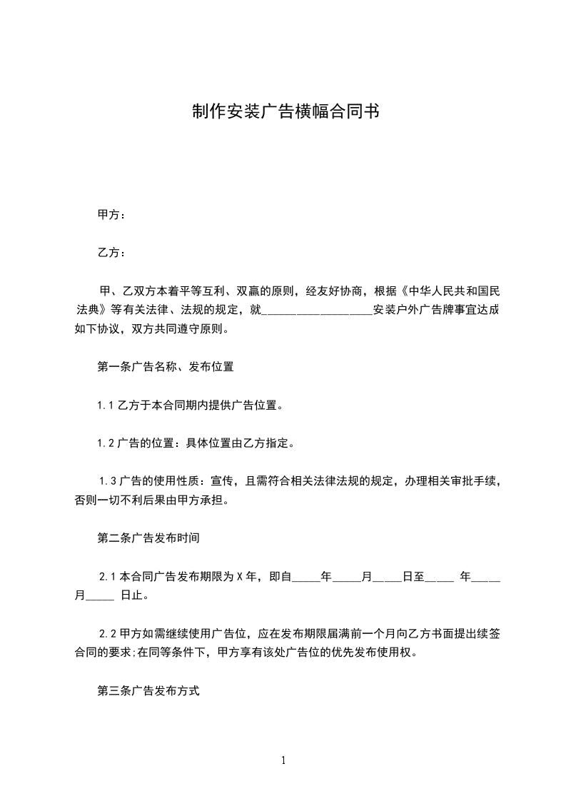 甲、乙双方本着平等互利、双赢的原则,经友好协商,根据《中华人民共和国i民法典》等有关法律、法规的规定,就___________________安装户外广告牌事宜达成如下协议,双方共同遵守原则。