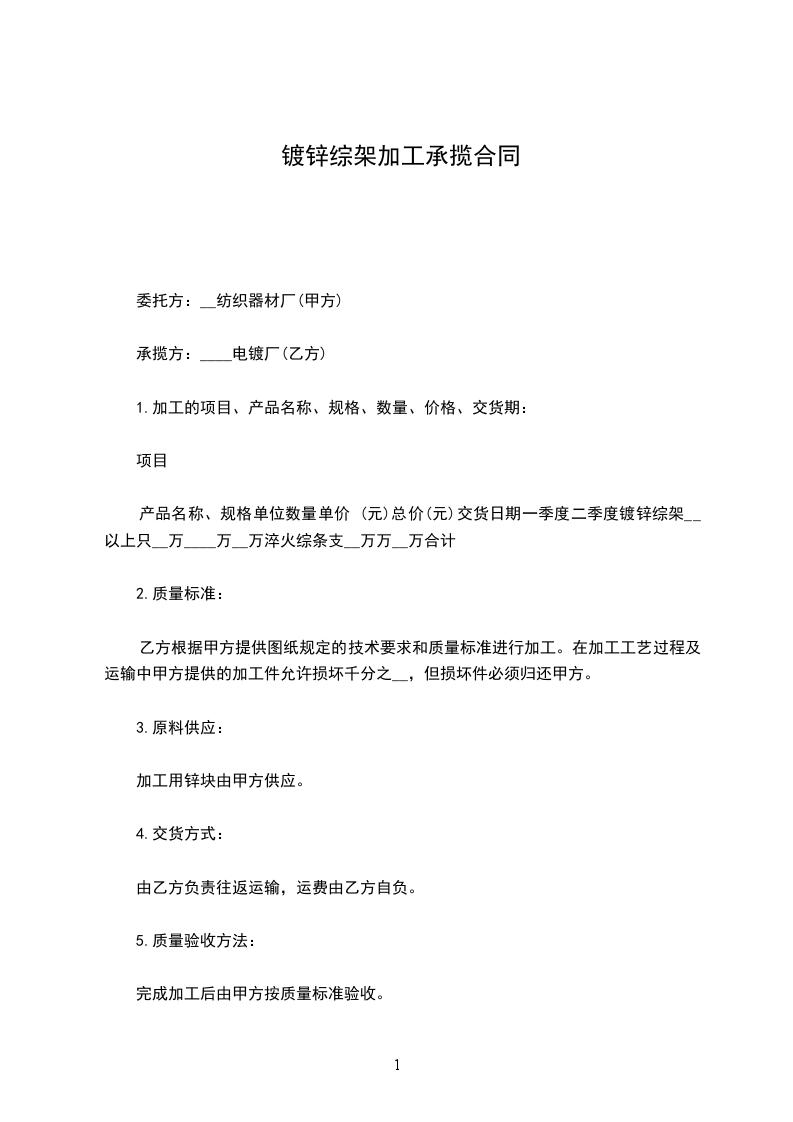 2.质量标准:乙方根据甲方提供图纸规定的技术要求和质量标准进行加工。在加工工艺过程及运输中甲方提供的加工件允许损坏千分之_____,但损坏件必须归还甲方。