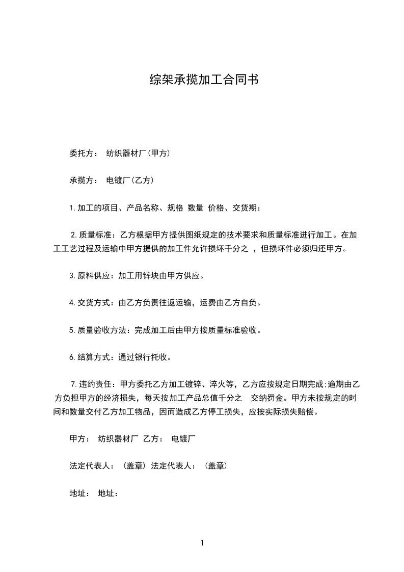 7.违约责任:甲方委托乙方加工镀锌、淬火等,乙方应按规定日期完成;逾期由乙方负担甲方的经济损失,每天按加工产品总值千分之______交纳罚金。甲方未按规定的时间和数量交付乙方加工物品,因而造成乙方停工损失,应按实际损失赔偿。