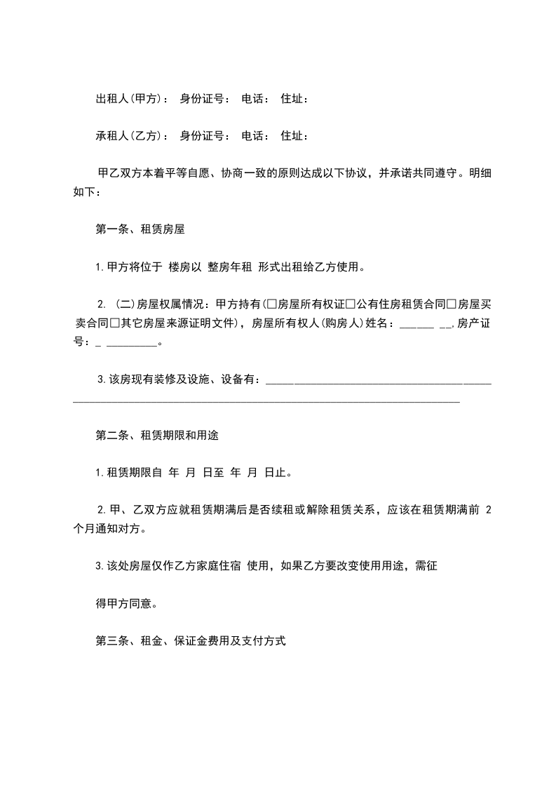 承租人(乙方): 身份证号: 电话: 住址: