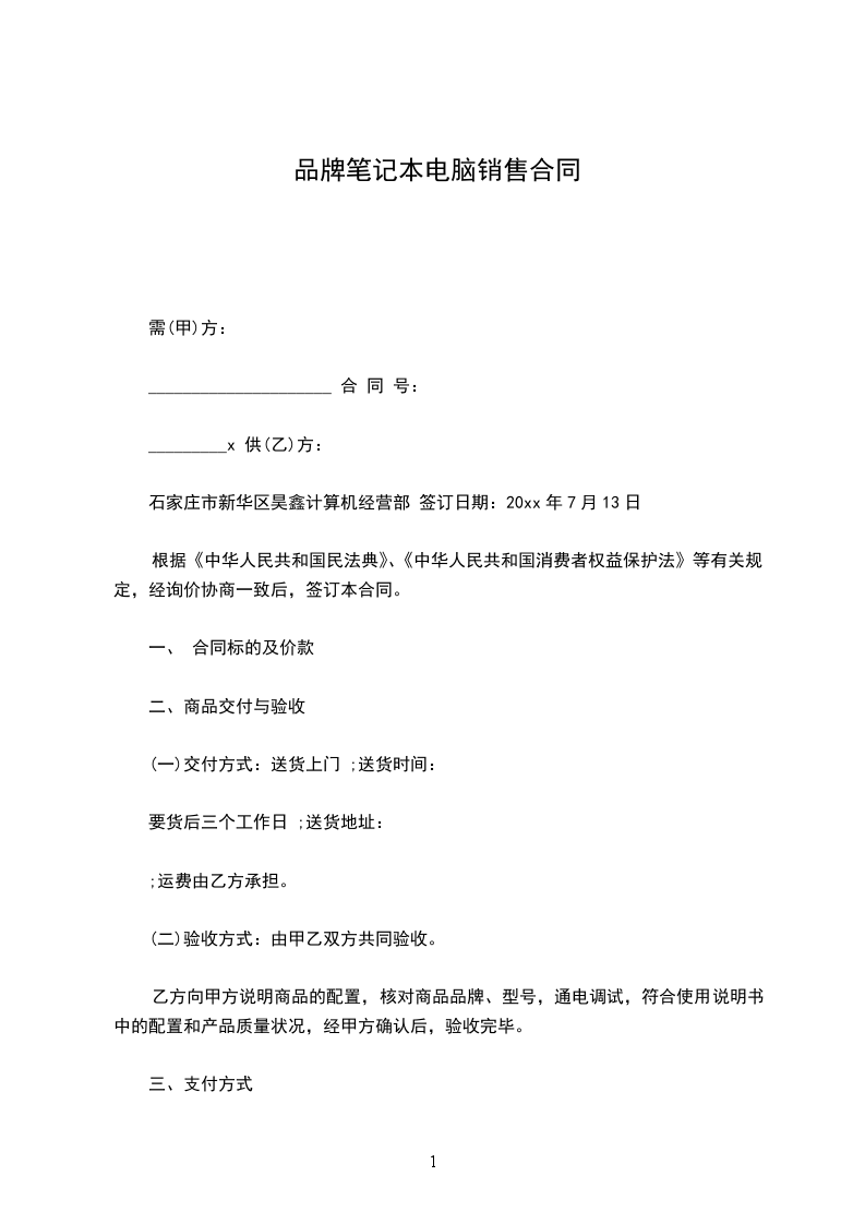 石家庄市新华区昊鑫计算机经营部 签订日期:20xx年7月13日