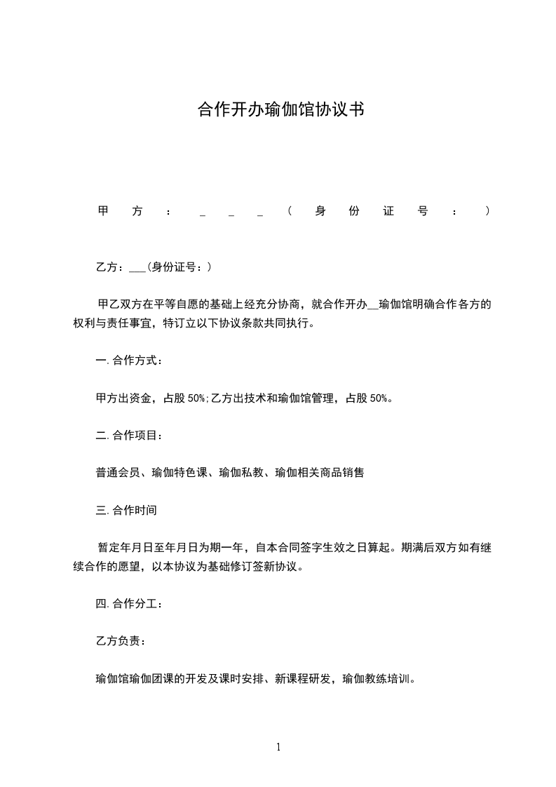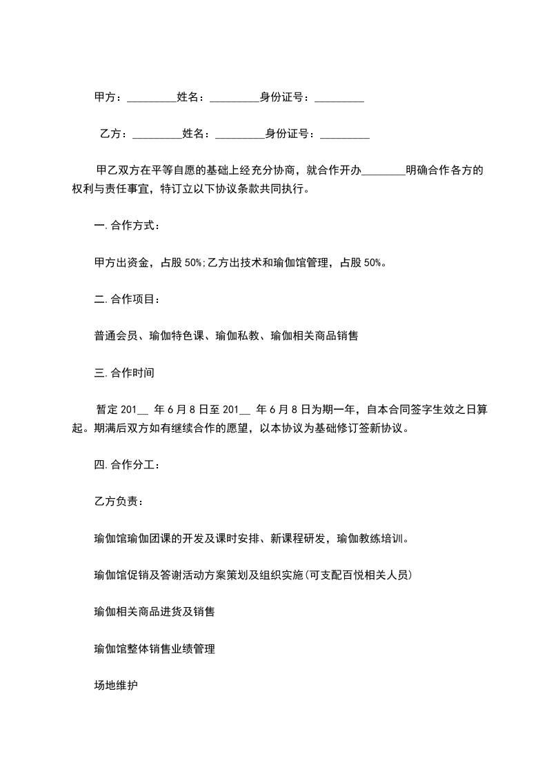 甲乙双方在平等自愿的基础上经充分协商,就合作开办__瑜伽馆明确合作各方的权利与责任事宜,特订立以下协议条款共同执行。