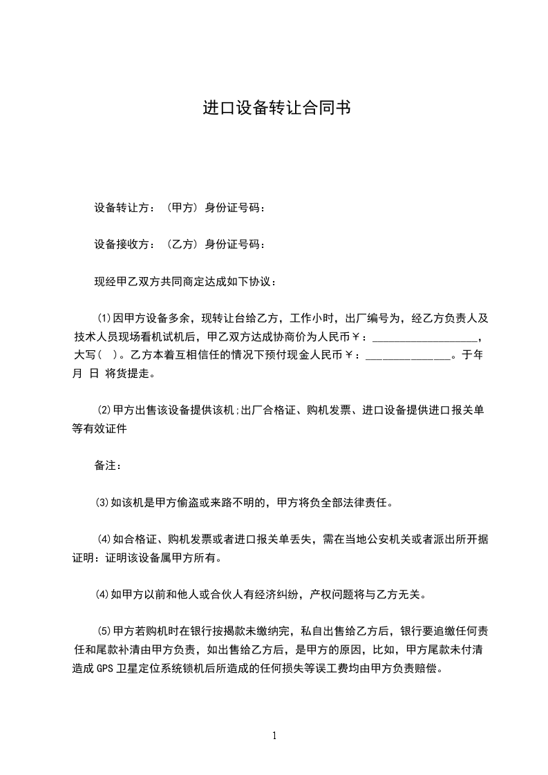 (1)因甲方设备多余,现转让台给乙方,工作小时,出厂编号为,经乙方负责人及技术人员现场看机试机后,甲乙双方达成协商价为人民币¥:___________________,大写( )。乙方本着互相信任的情况下预付现金人民币¥:_______________。于年 月 日 将货提走。