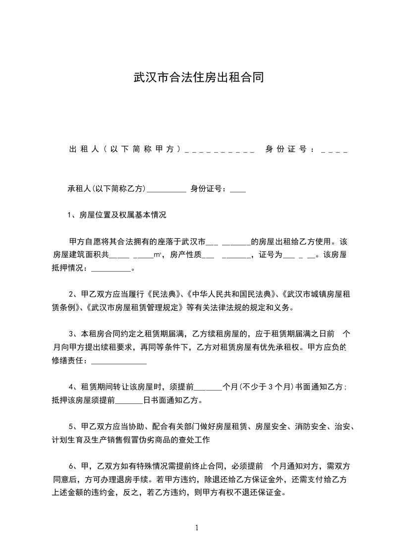 甲方自愿将其合法拥有的座落于武汉市___ _______的房屋出租给乙方使用。该房屋建筑面积共_____ _____㎡,房产性质___ _______,证号为___ _ __。该房屋抵押情况:__________。