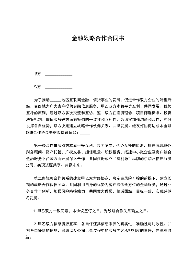第一条 双方建立战略合作关系,旨在于为乙方会员企业搭建融资平台,促进企业、金融机构和区域经济可持续发展。