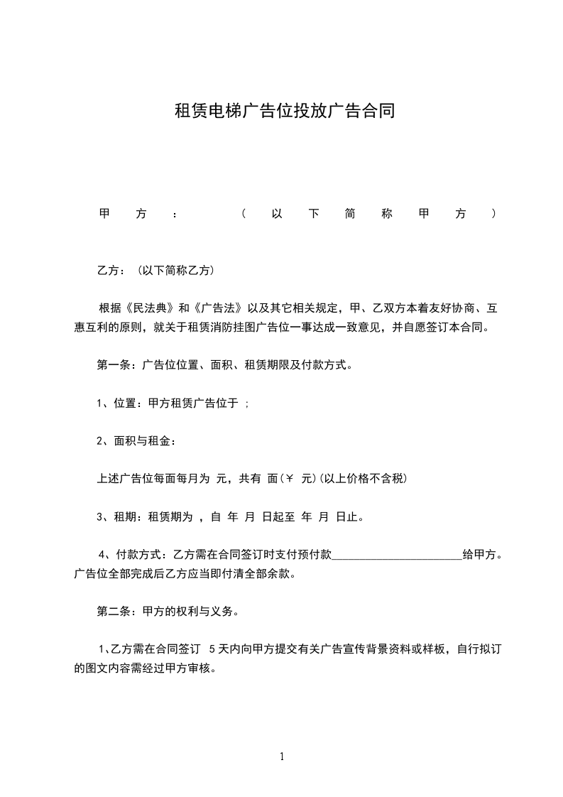 根据《民法典》和《广告法》以及其它相关规定,甲、乙双方本着友好协商、互惠互利的原则,就关于租赁消防挂图广告位一事达成一致意见,并自愿签订本合同。