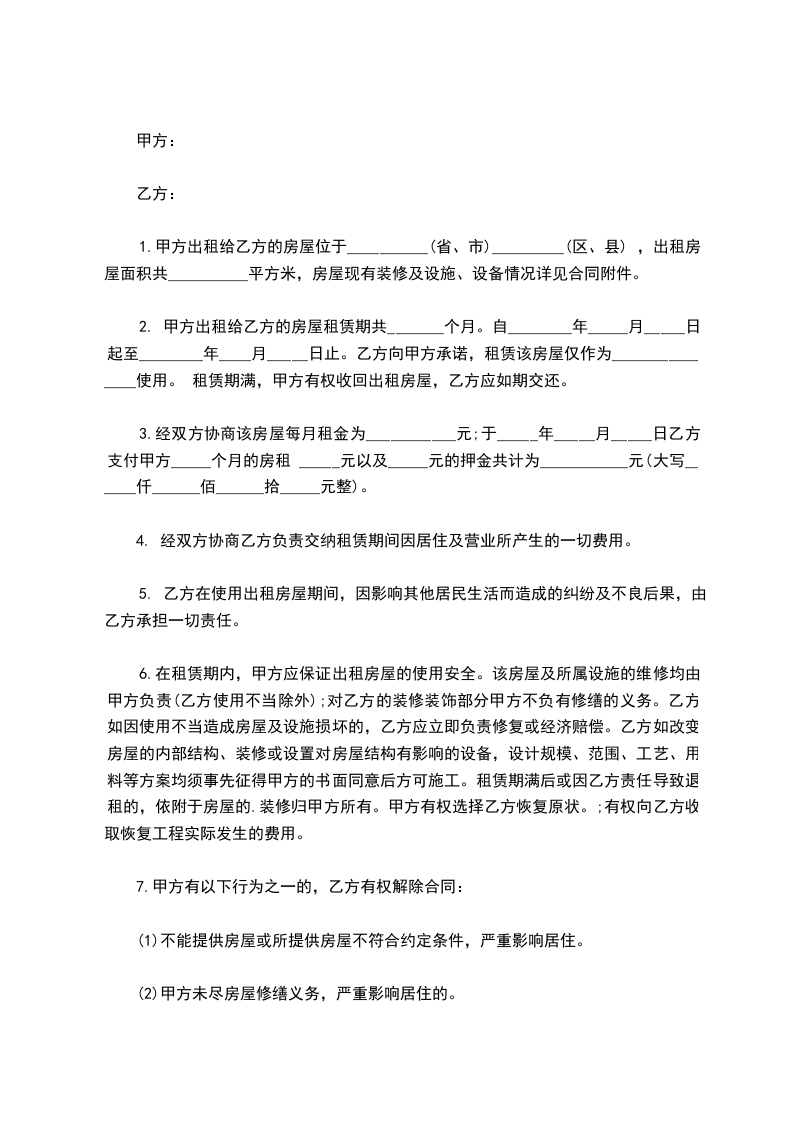 10.房屋租赁期间.甲方因不能提供本合同约定的房屋或其他原因单方面提出解除合同的,应支付乙方本合同租金总额50%的违约金,甲方应照常退还押金给乙方。