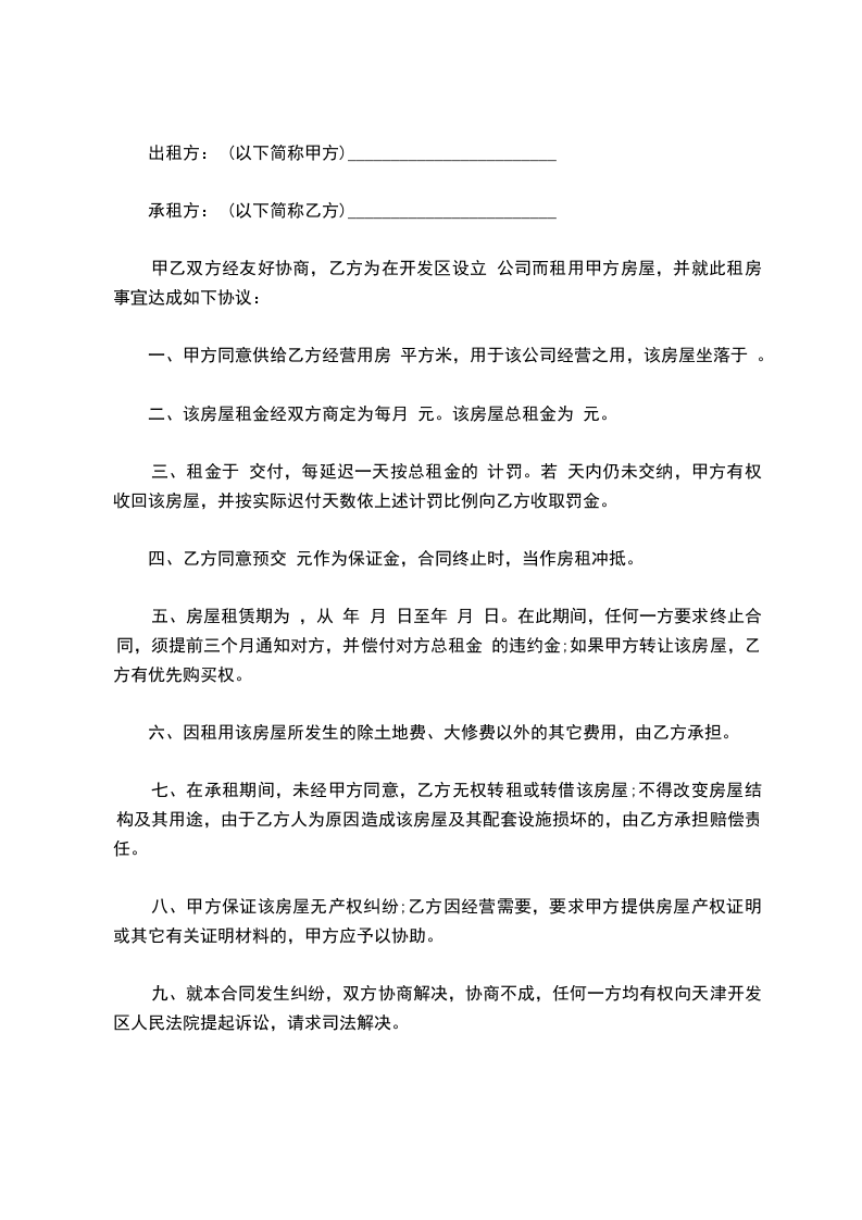 九、就本合同发生纠纷,双方协商解决,协商不成,任何一方均有权向天津开发区人民法院提起诉讼,请求司法解决。
