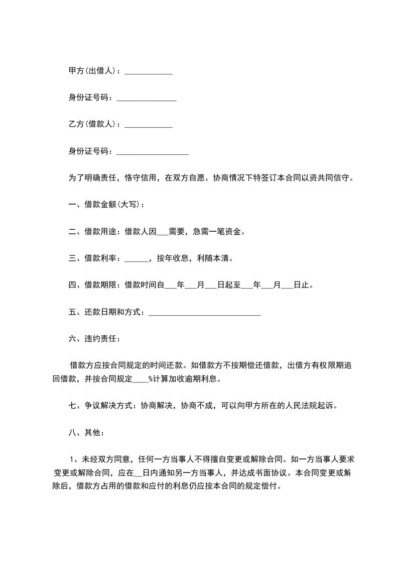 1、未经双方同意,任何一方当事人不得擅自变更或解除合同。如一方当事人要求变更或解除合同,应在__日内通知另一方当事人,并达成书面协议。本合同变更或解除后,借款方占用的借款和应付的利息仍应按本合同的规定偿付。