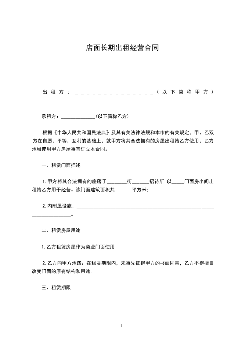 1.甲方将其合法拥有的座落于________街_______招待所 以_____门面房小间出租给乙方用于经营。该门面建筑面积共_______平方米;