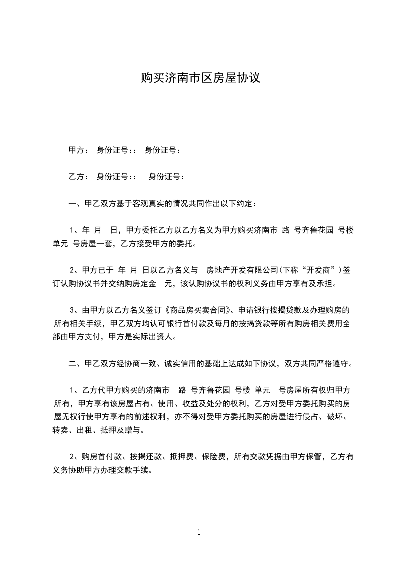 1、年 月 日,甲方委托乙方以乙方名义为甲方购买济南市 路 号齐鲁花园 号楼 单元 号房屋一套,乙方接受甲方的委托。