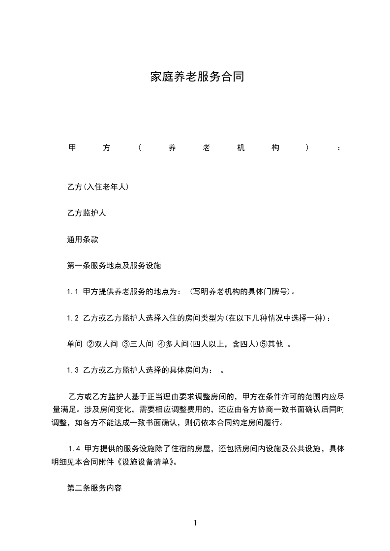 1.1 甲方提供养老服务的地点为: (写明养老机构的具体门牌号)。