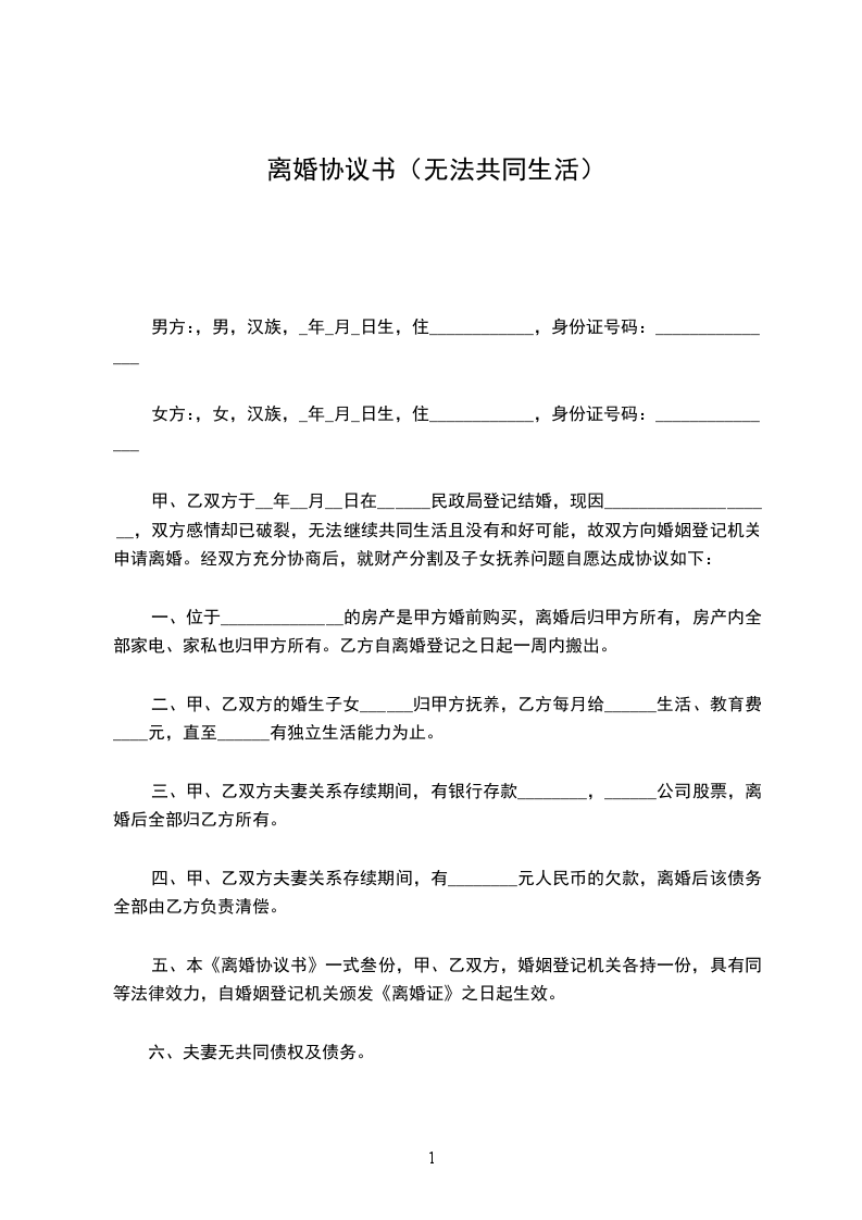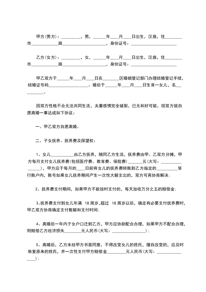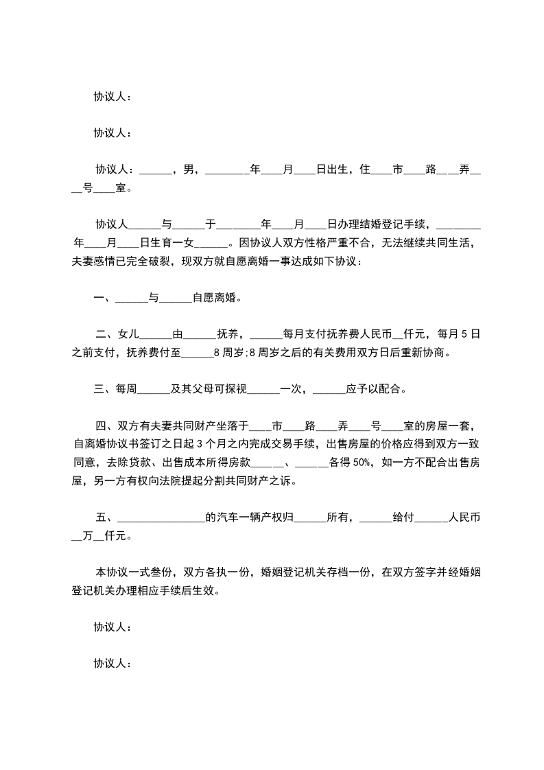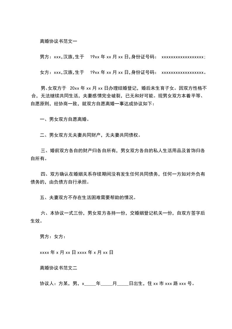 男、女双方于20xx年xx月xx日办理结婚登记,婚后未生育子女。因双方性格不合,无法继续共同生活,夫妻感情完全破裂,已无和好可能。现男女双方本着平等、自愿原则,经协商一致,就双方自愿离婚一事达成协议如下: