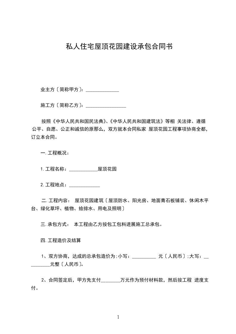 按照《中华人民共和国民法典》、《中华人民共和国建筑法》等相 关法律、遵循公平、自愿、公正和诚信的原那么,双方就本合同私家 屋顶花园工程事项协商全都,订立本合同。