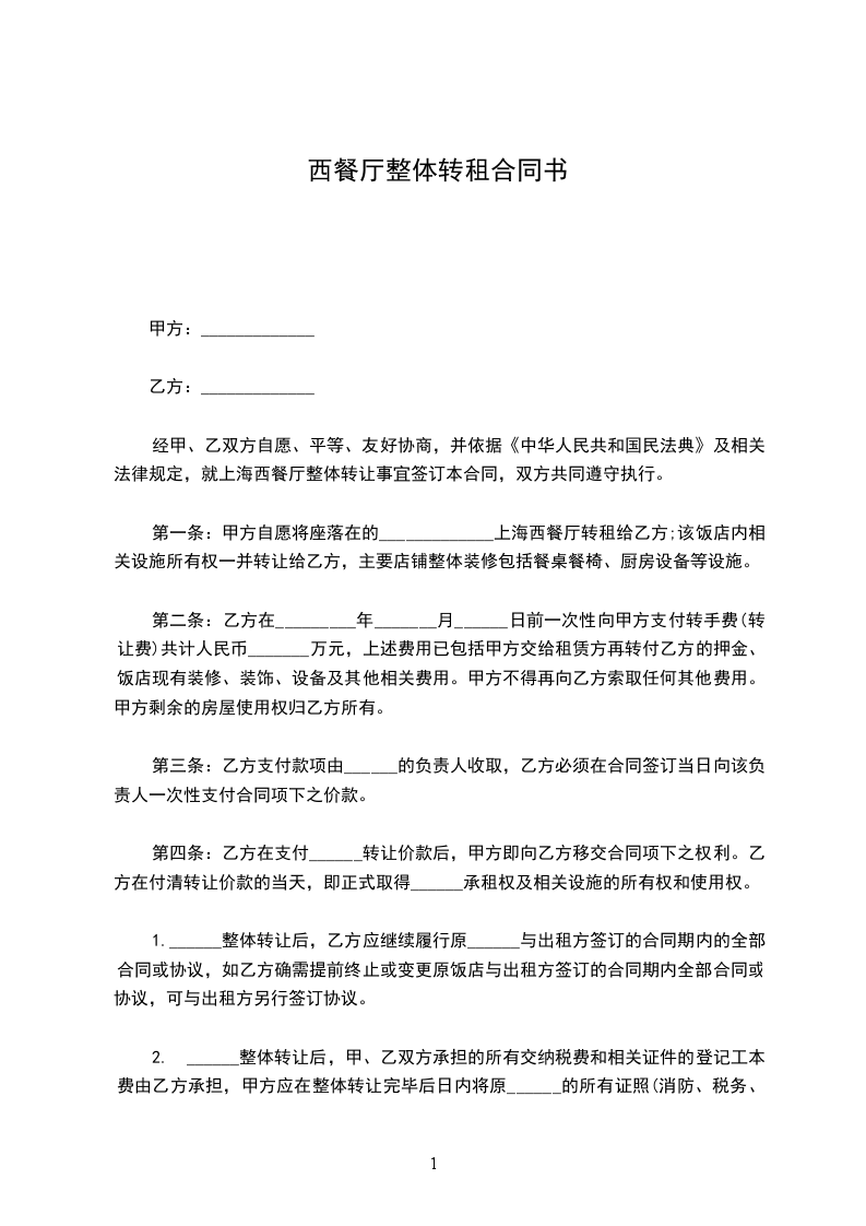 经甲、乙双方自愿、平等、友好协商,并依据《中华人民共和国民法典》及相关法律规定,就上海西餐厅整体转让事宜签订本合同,双方共同遵守执行。