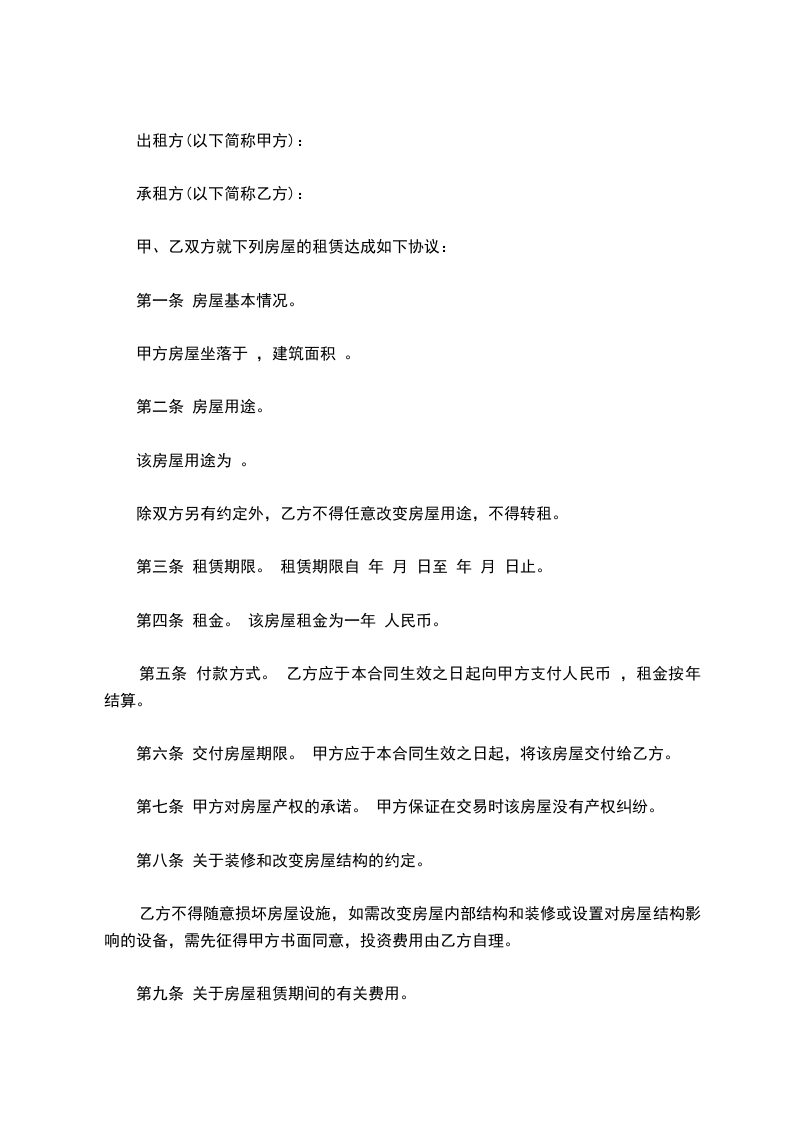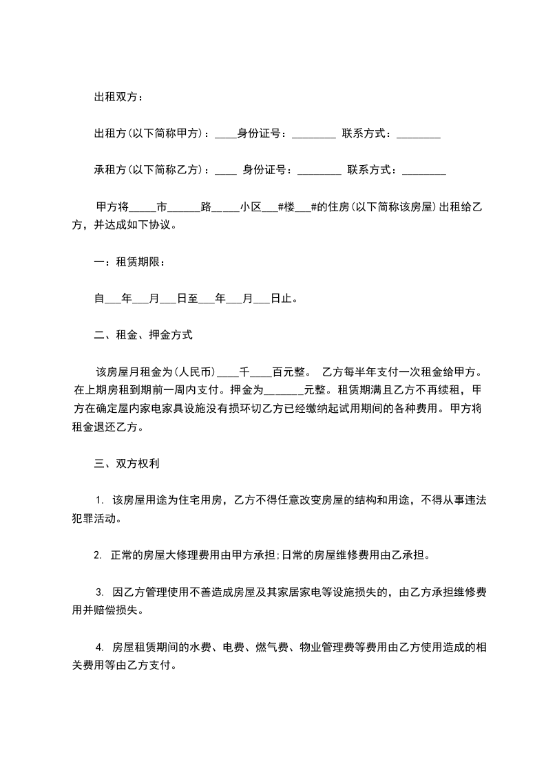该房屋月租金为(人民币)____千____百元整。 乙方每半年支付一次租金给甲方。在上期房租到期前一周内支付。押金为_______元整。租赁期满且乙方不再续租,甲方在确定屋内家电家具设施没有损环切乙方已经缴纳起试用期间的各种费用。甲方将租金退还乙方。