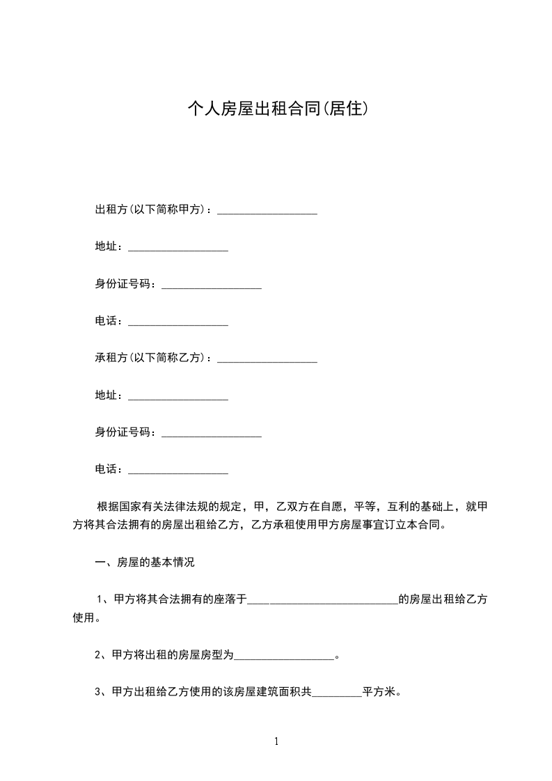 出租方(以下简称甲方):____身份证号:________ 联系方式:________