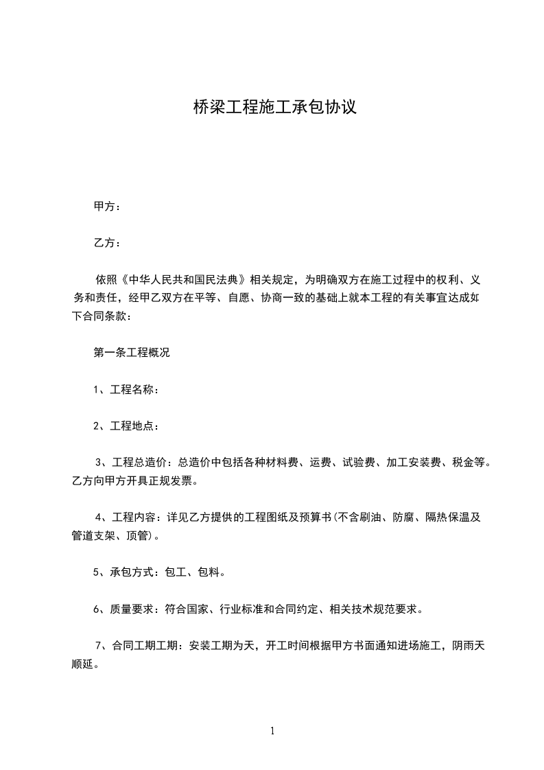 桥梁工程施工承包协议