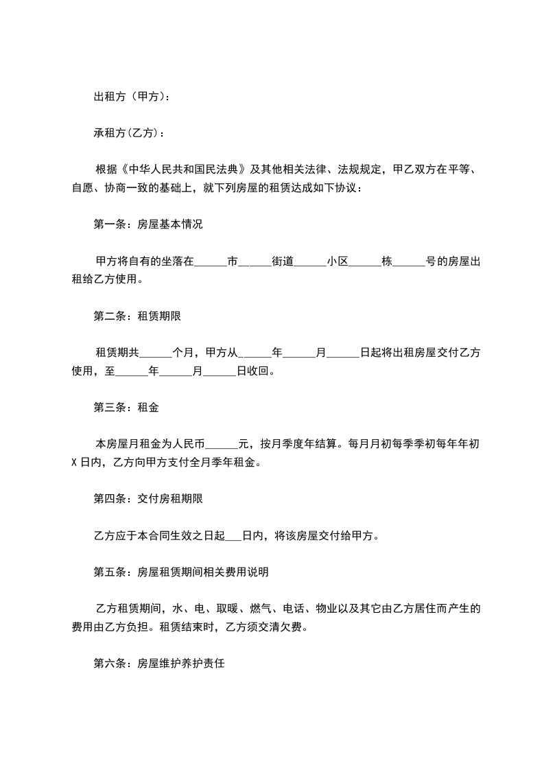 根据《中华人民共和国民法典》及其他相关法律、法规规定,甲乙双方在平等、自愿、协商一致的基础上,就下列房屋的租赁达成如下协议: