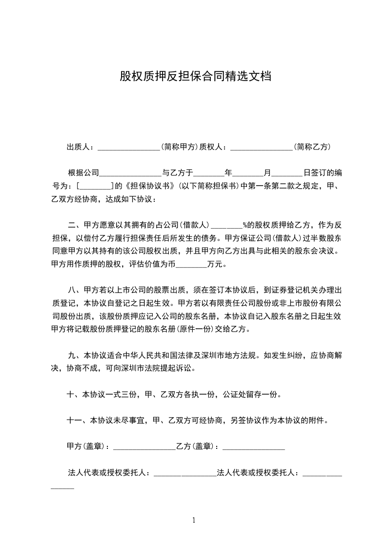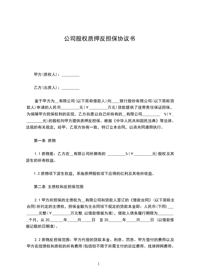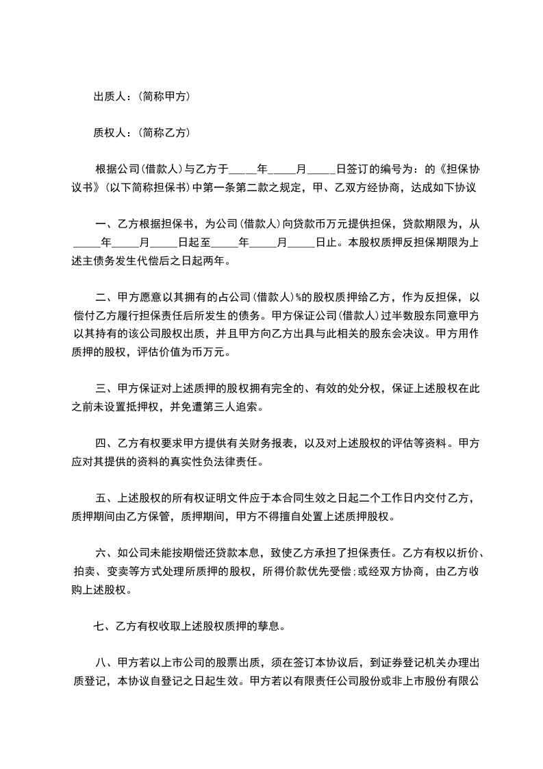 二、甲方愿意以其拥有的占公司(借款人)%的股权质押给乙方,作为反担保,以偿付乙方履行担保责任后所发生的债务。甲方保证公司(借款人)过半数股东同意甲方以其持有的该公司股权出质,并且甲方向乙方出具与此相关的股东会决议。甲方用作质押的股权,评估价值为币万元。