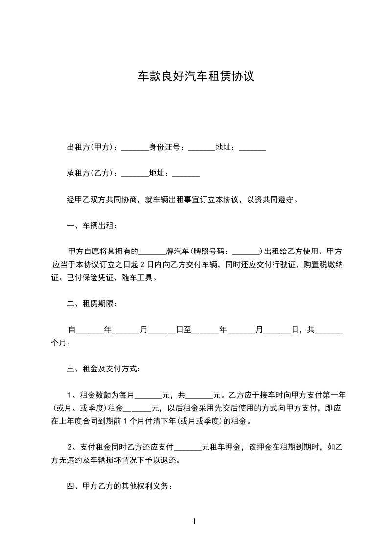 为明确出甲方与乙方权利和义务的关系,根据平等互利、自愿有偿、诚实信用的原则,经甲乙双方协商一致,达成汽车租赁合同,条款如下: