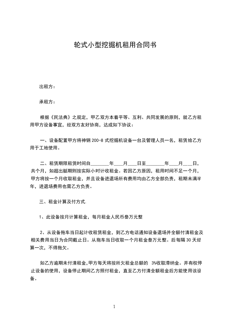 轮式小型挖掘机租用合同书