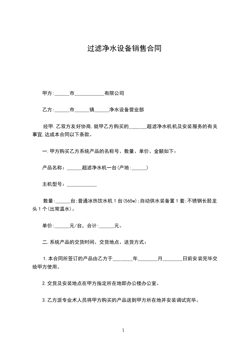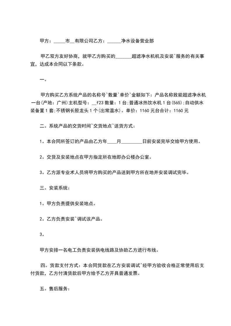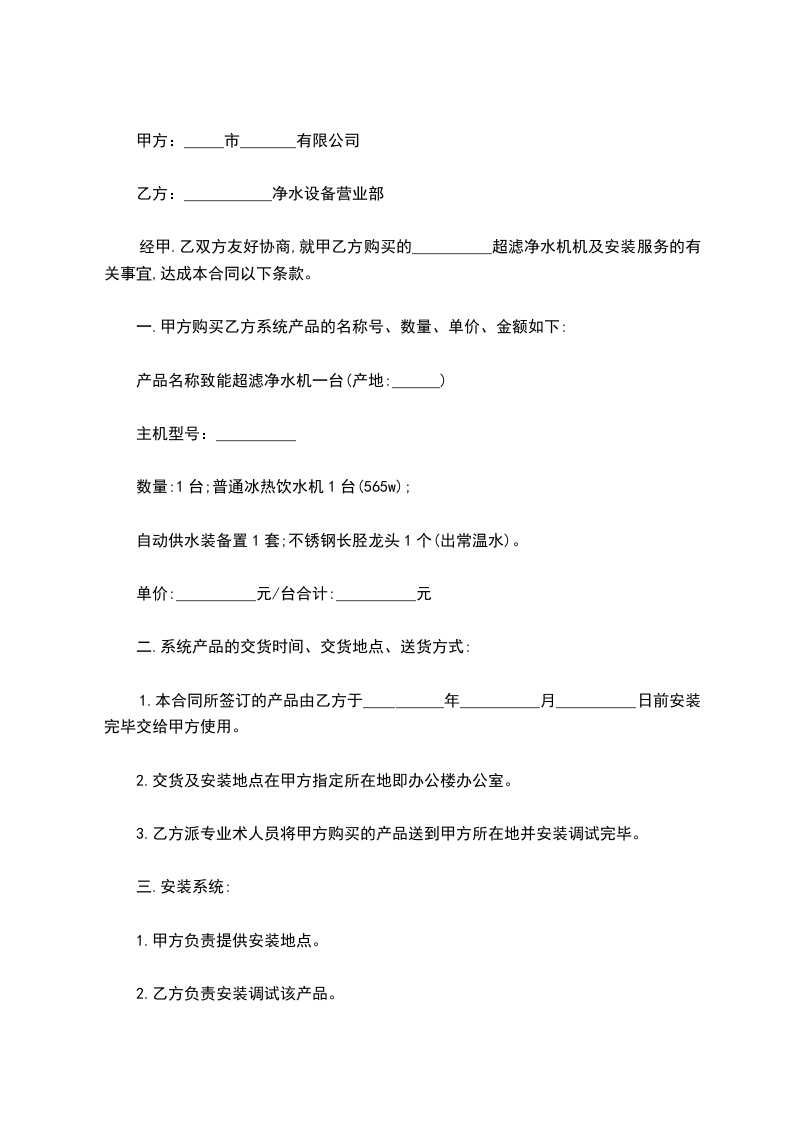 经甲、乙双方友好协商,就甲乙方购买的 _________ 超滤净水机及安装、服务的有关事宜,达成本合同以下条款。