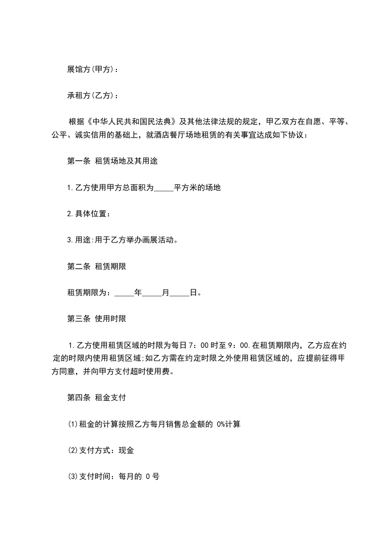 根据《中华人民共和国民法典》及其他法律法规的规定,甲乙双方在自愿、平等、公平、诚实信用的基础上,就酒店餐厅场地租赁的有关事宜达成如下协议: