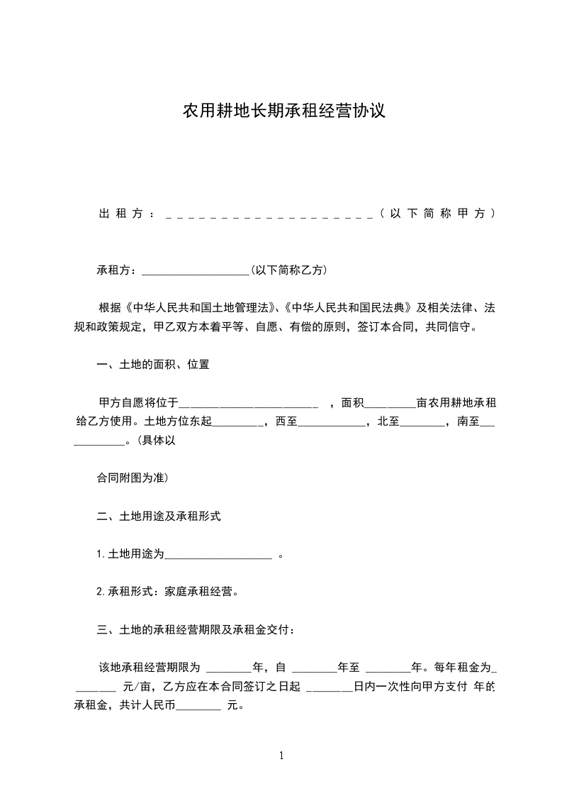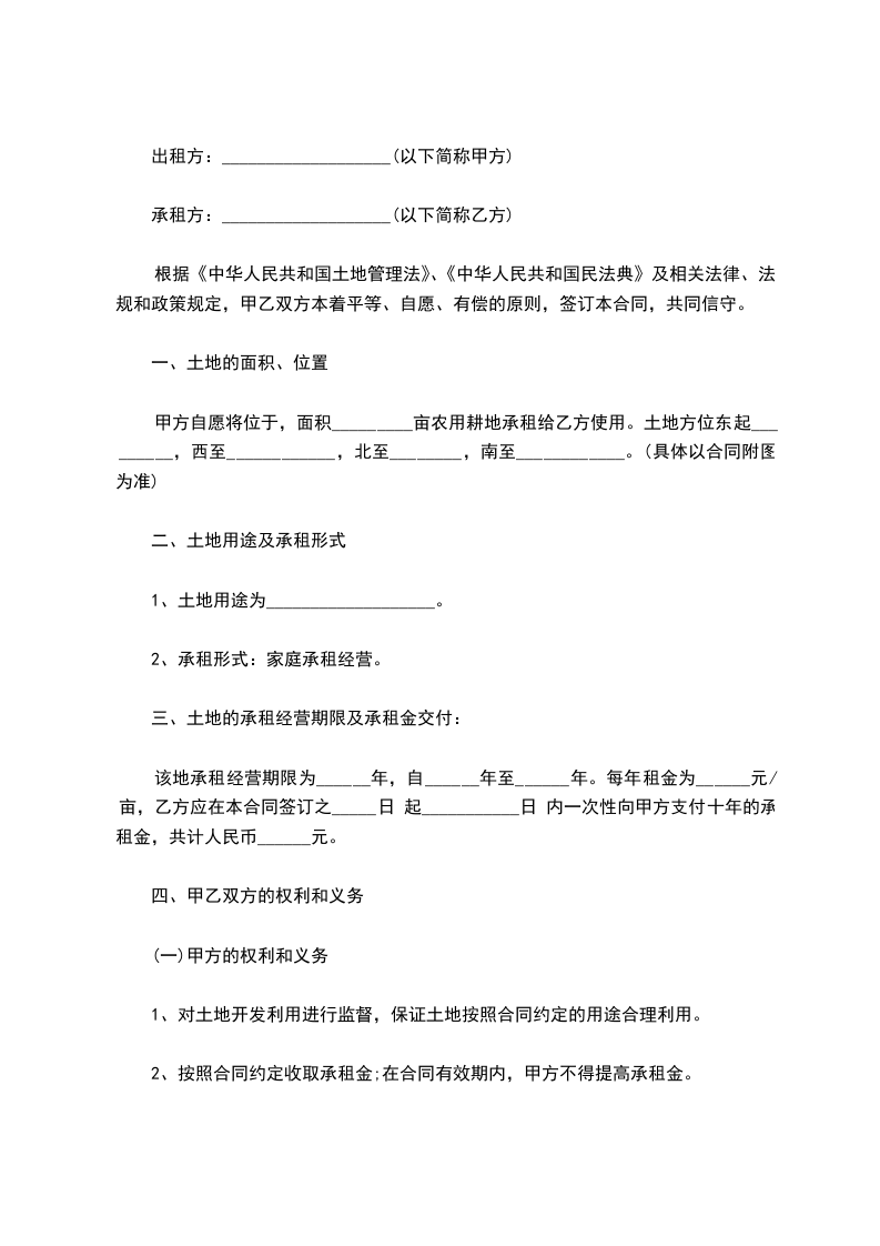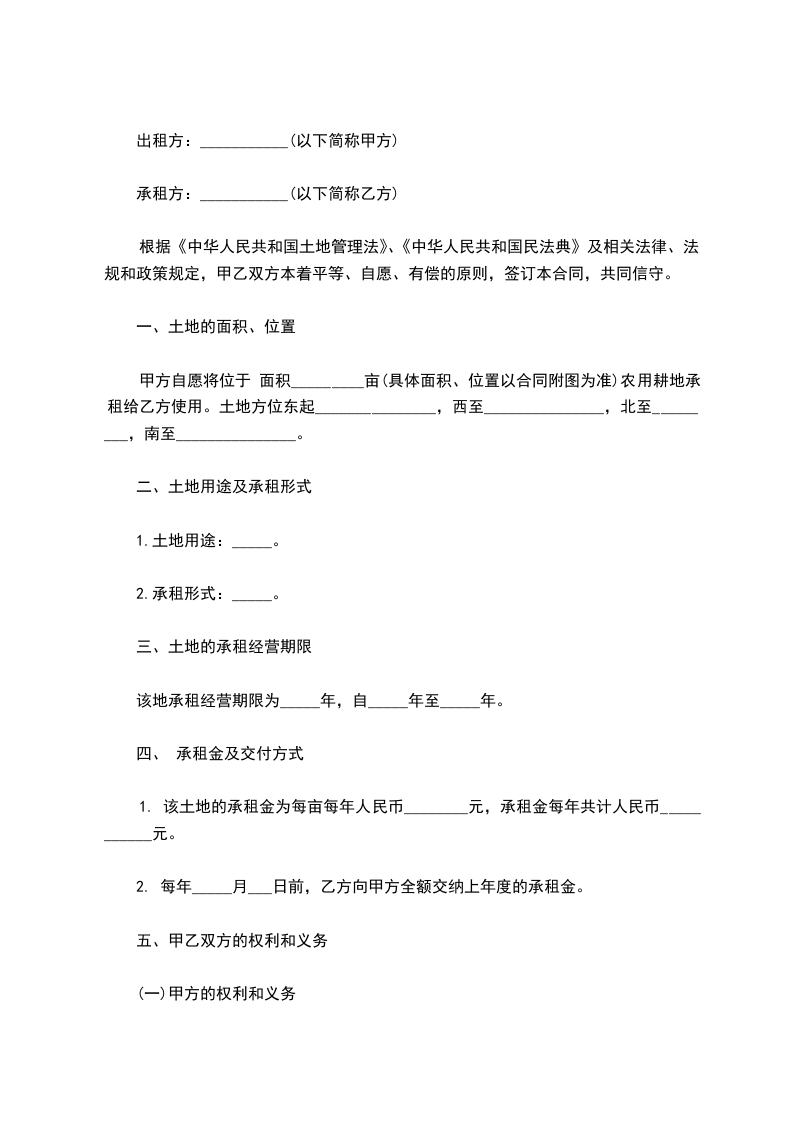 甲方自愿将位于 面积_________亩(具体面积、位置以合同附图为准)农用耕地承租给乙方使用。土地方位东起_______________,西至_______________,北至_________,南至_______________。