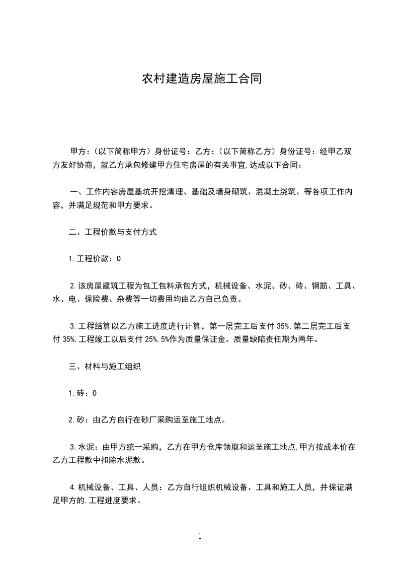 农村楼房建造施工合同