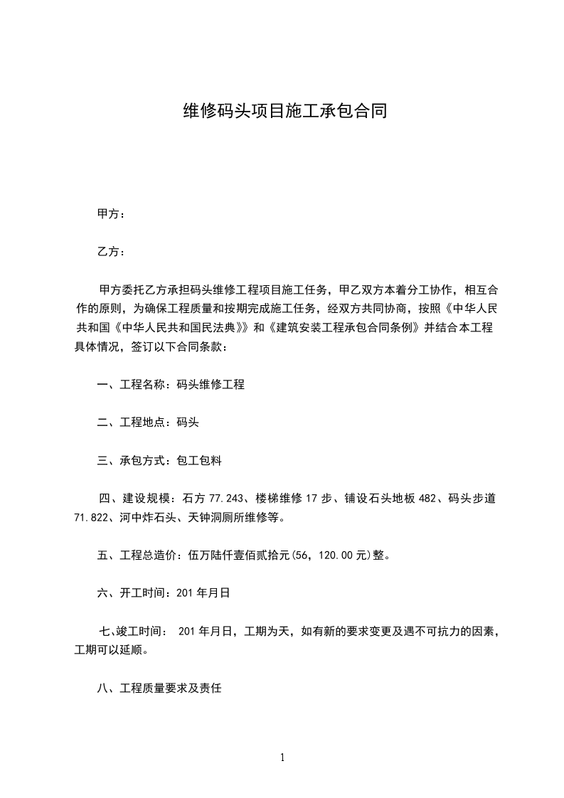 甲方委托乙方承担码头维修工程项目施工任务,甲乙双方本着分工协作,相互合作的原则,为确保工程质量和按期完成施工任务,经双方共同协商,按照《中华人民共和国民法典》和《建筑安装工程承包合同条例》并结合本工程具体情况,签订以下合同条款: