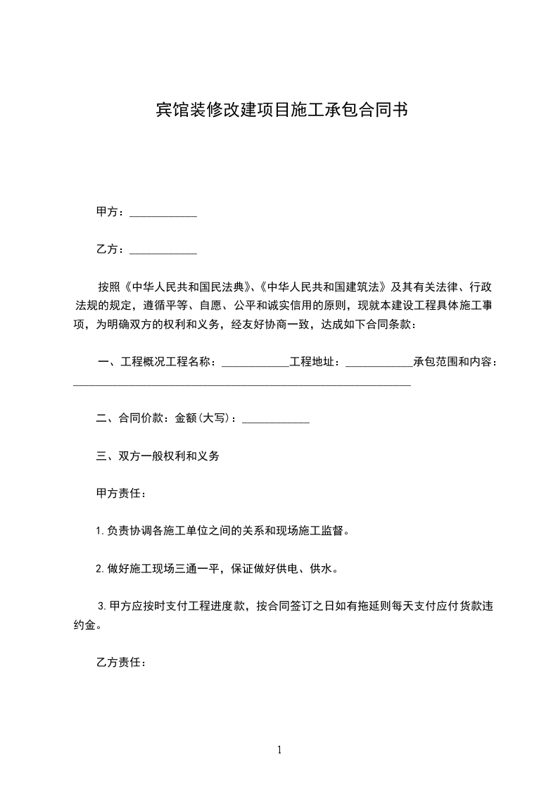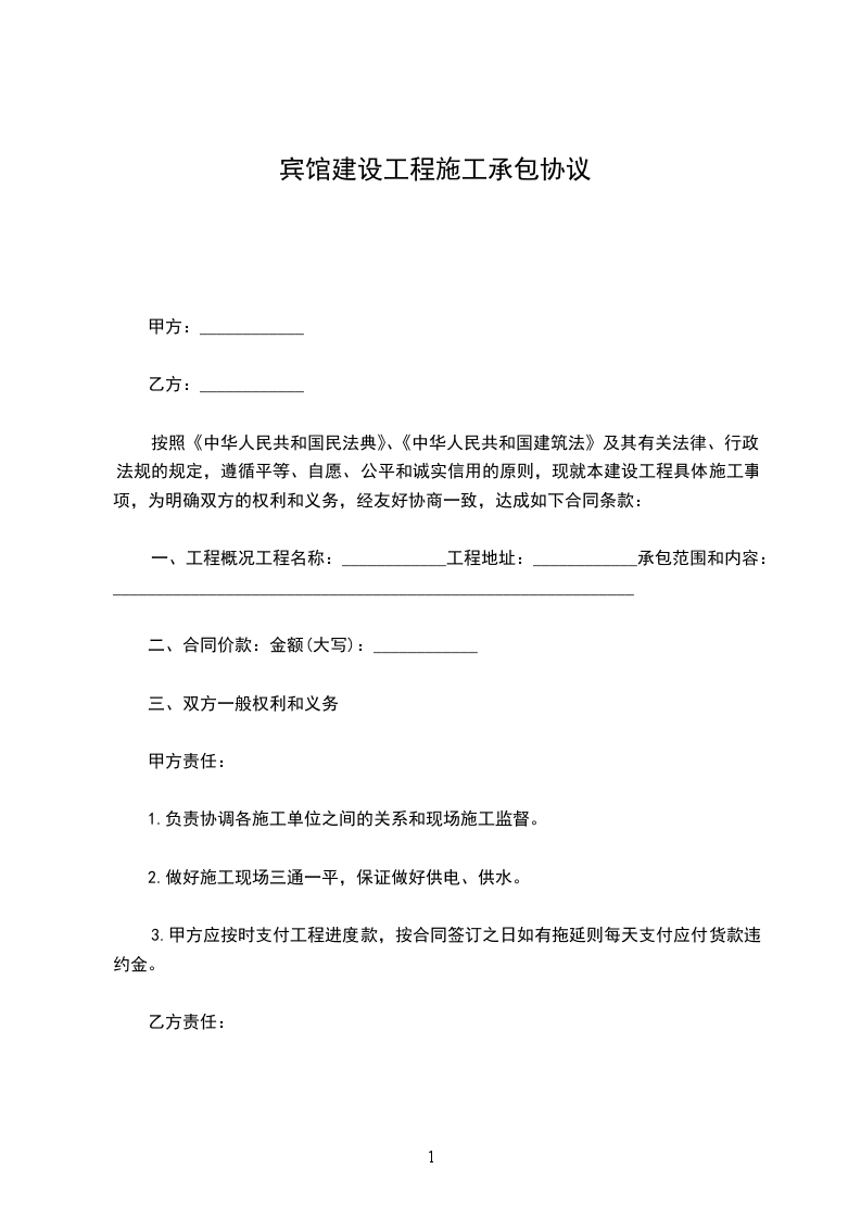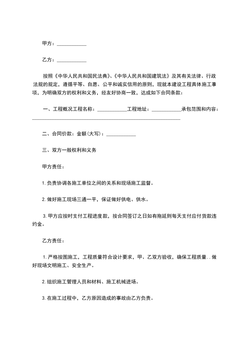 按照《中华人民共和国民法典》、《中华人民共和国建筑法》及其有关法律、行政法规的规定,遵循平等、自愿、公平和诚实信用的原则,现就本建设工程具体施工事项,为明确双方的权利和义务,经友好协商一致,达成如下合同条款: