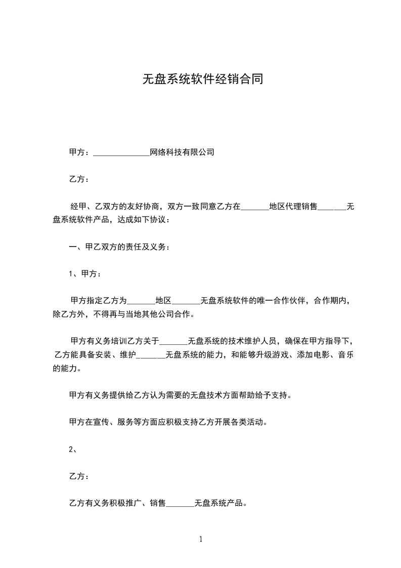 经甲、乙双方的友好协商,双方一致同意乙方在_______地区代理销售_______无盘系统软件产品,达成如下协议:
