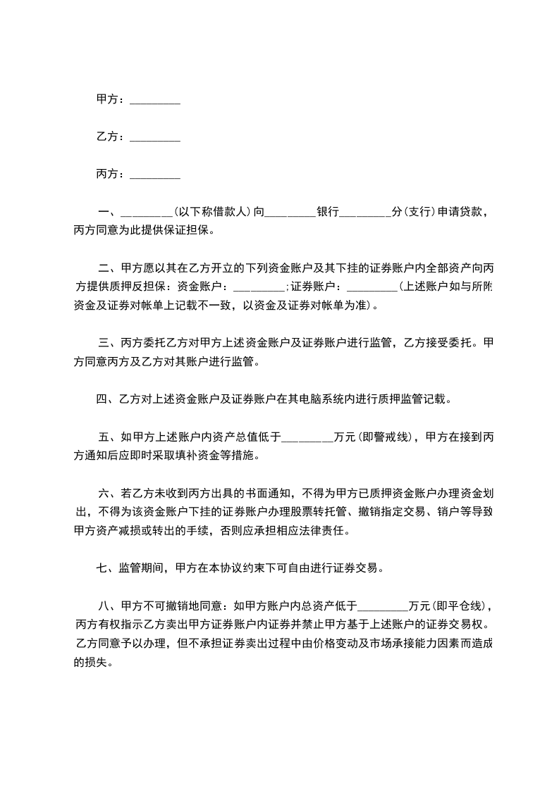 一、甲方提供资金账户并且开通网上交易。甲方委托乙方代理操作甲方在________________(证券营业部)开设的资金账户,资金账号为_________________ 。交易密码甲乙双方共享,甲方可以查询,但不能操作。