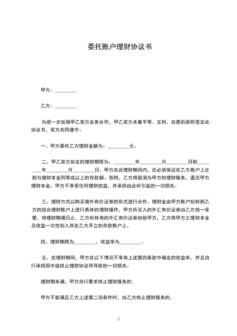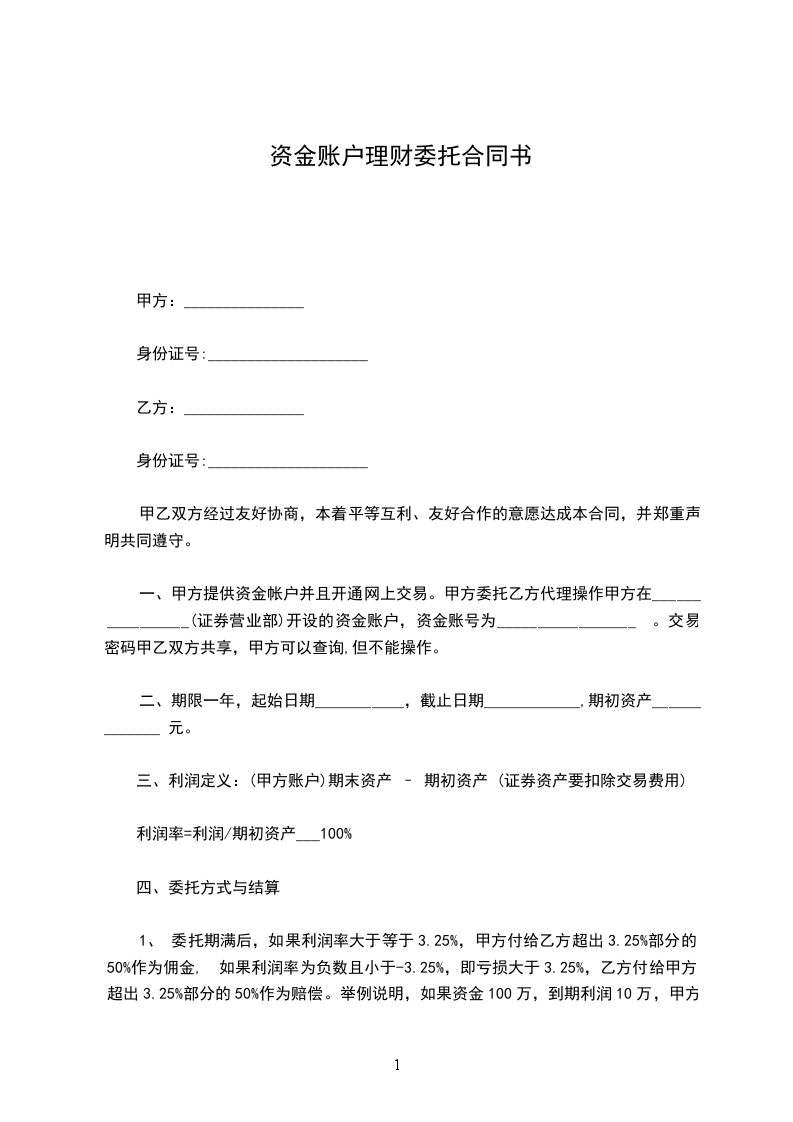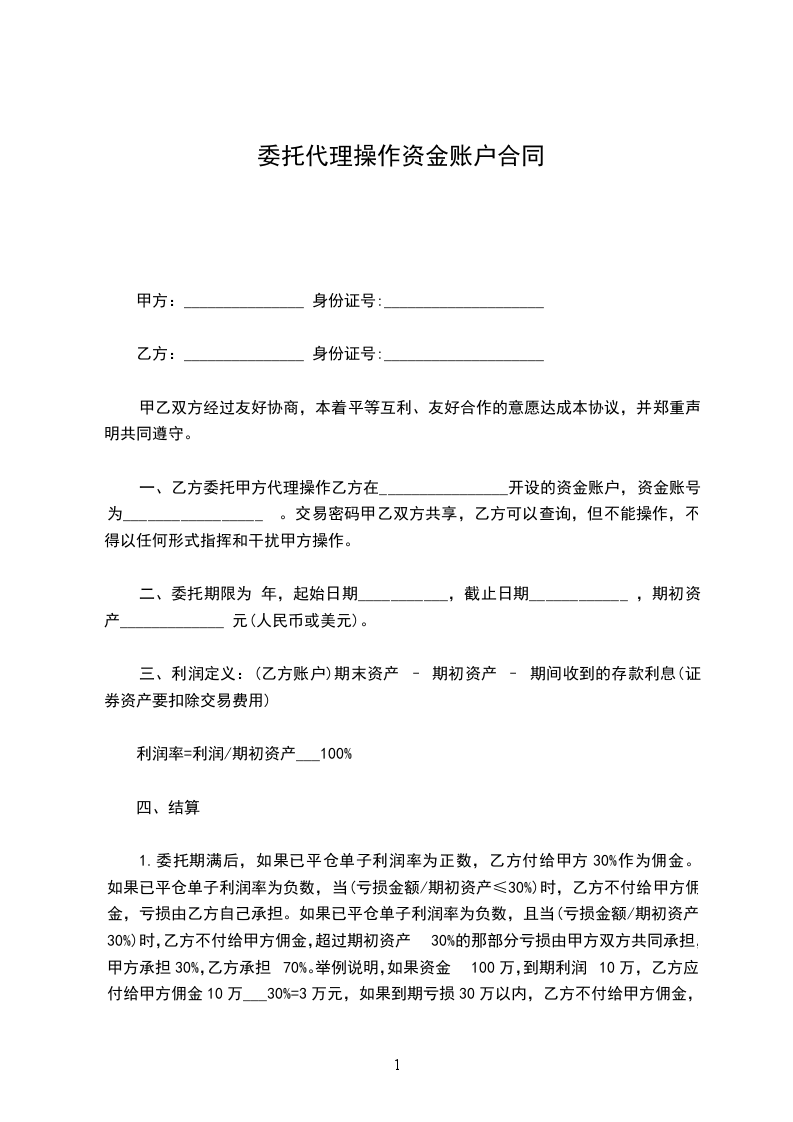 2、未到委托结束日期,甲方不得取用账户资金。如果甲方一定要取用资金,若此时利润为正数,甲方付给乙方利润的50% 作为佣金,然后重新签订合同。