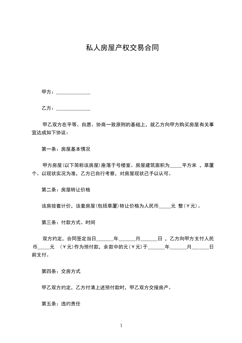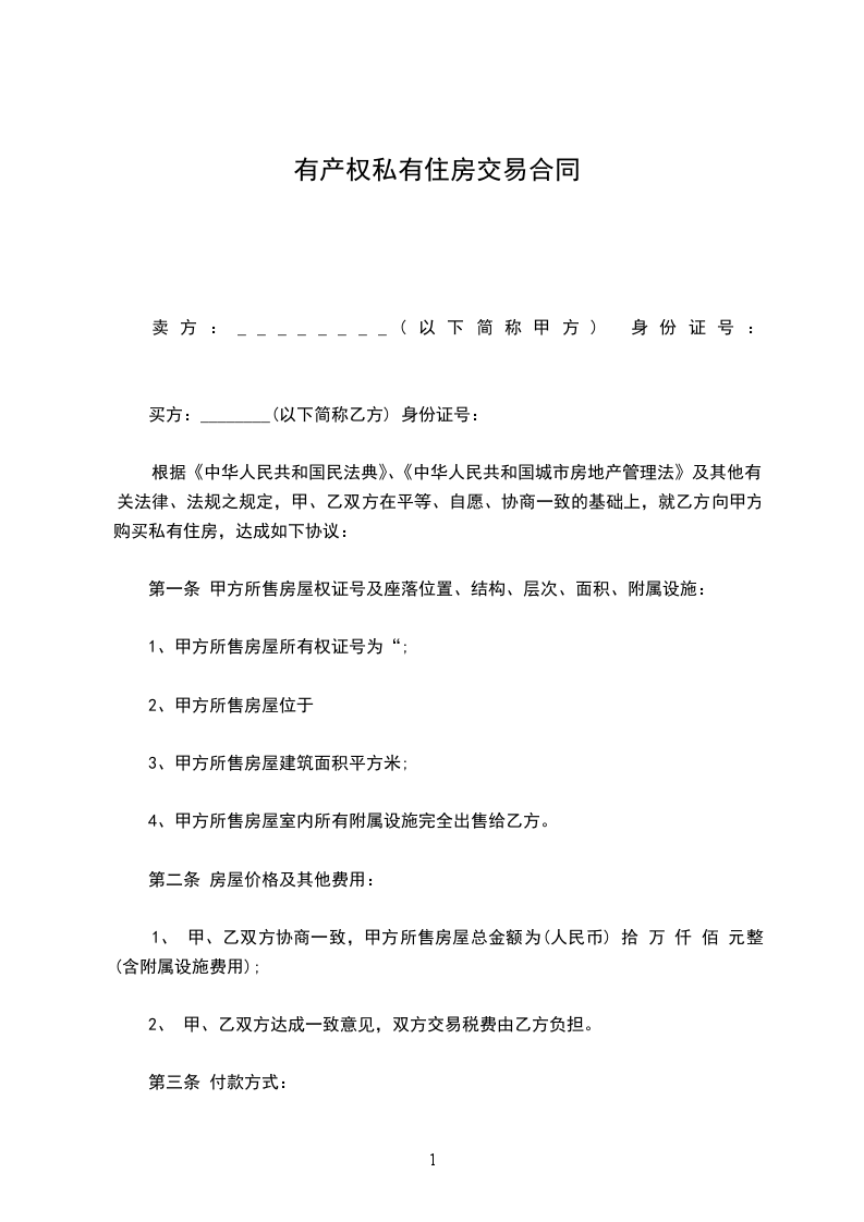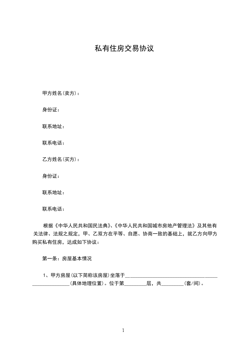 根据《中华人民共和国民法典》、《中华人民共和国城市房地产管理法》及其他有关法律、法规之规定,甲、乙双方在平等、自愿、协商一致的基础上,就乙方向甲方购买私有住房,达成如下协议: