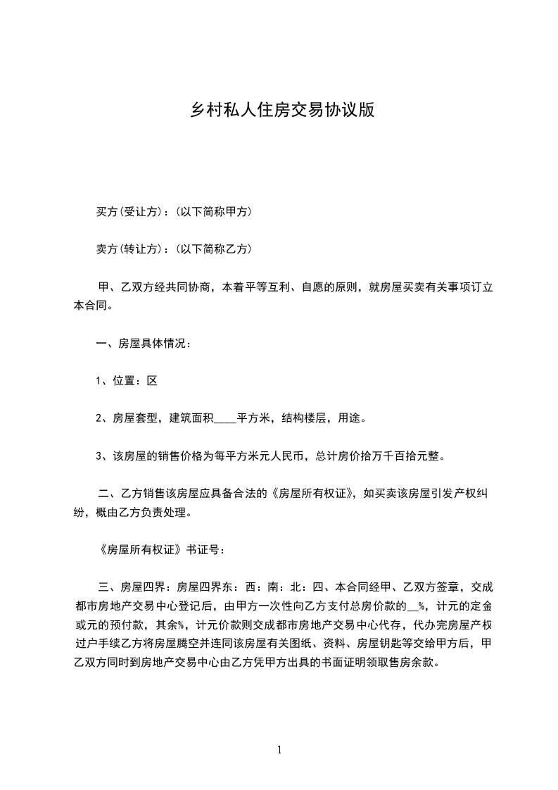 1、 甲、乙双方协商一致,甲方所售房屋总金额为(人民币) 拾 万 仟 佰 元整(含附属设施费用);