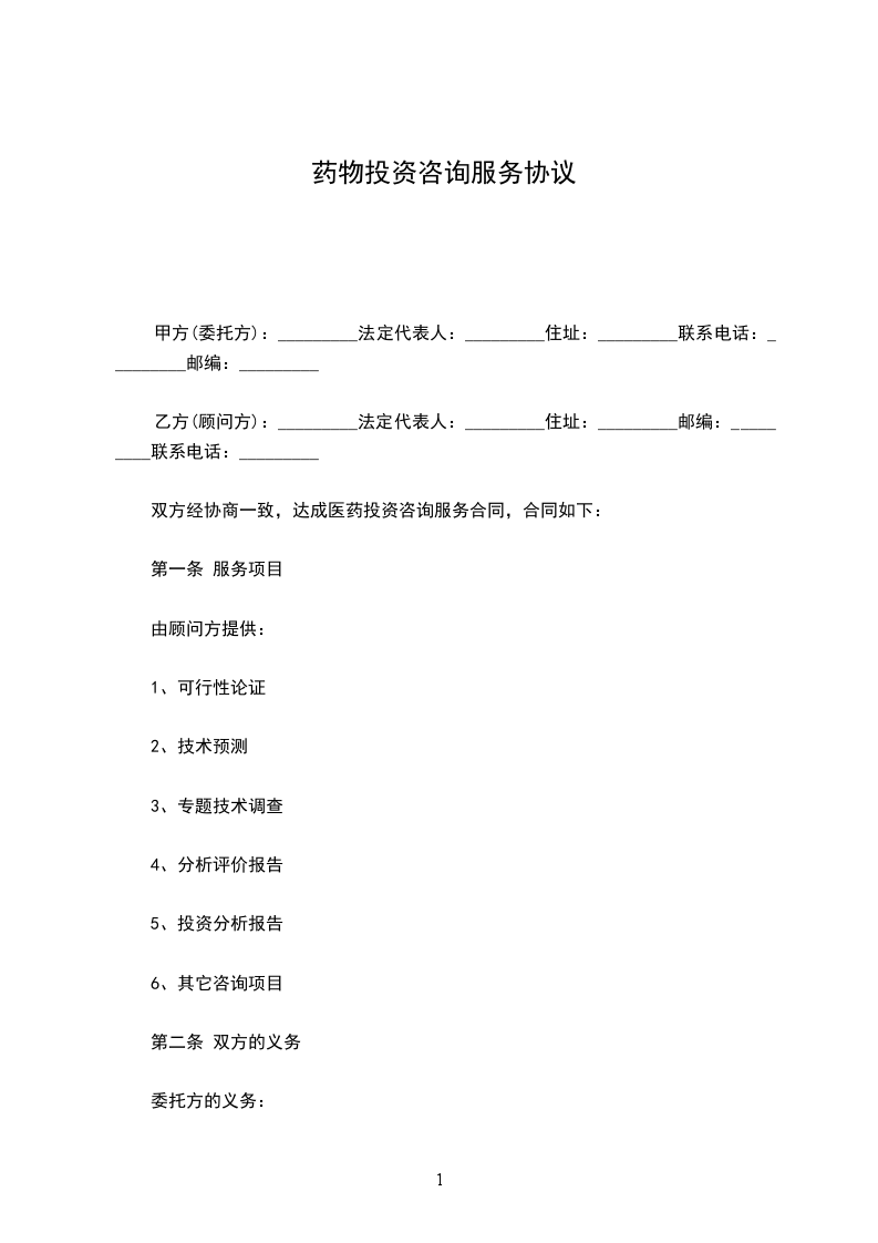 双方经协商一致,达成医药投资咨询服务合同,合同如下: