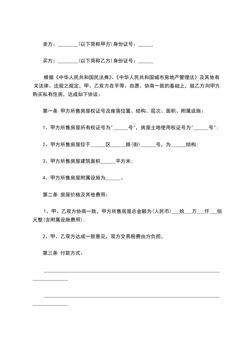 根据《中华人民共和国民法典》、《中华人民共和国城市房地产管理法》及其他有关法律、法规之规定,甲、乙双方在平等、自愿、协商一致的基础上,就乙方向甲方购买私有住房,达成如下协议: