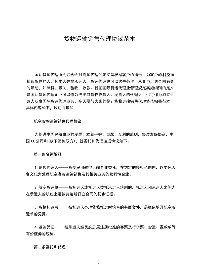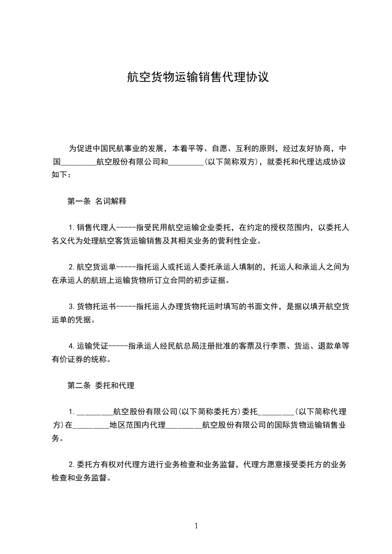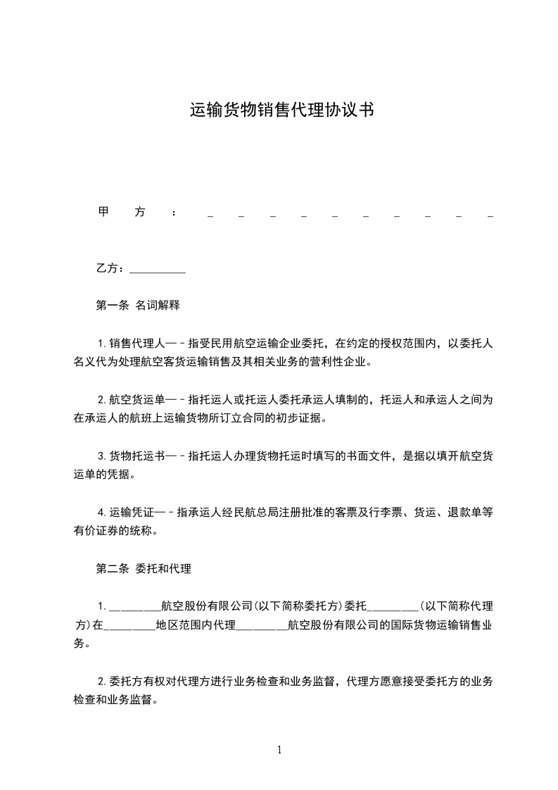 1._________航空股份有限公司(以下简称委托方)委托_________(以下简称代理方)在_________地区范围内代理_________航空股份有限公司的国际货物运输销售业务。