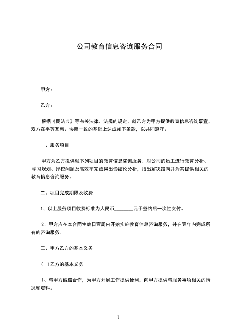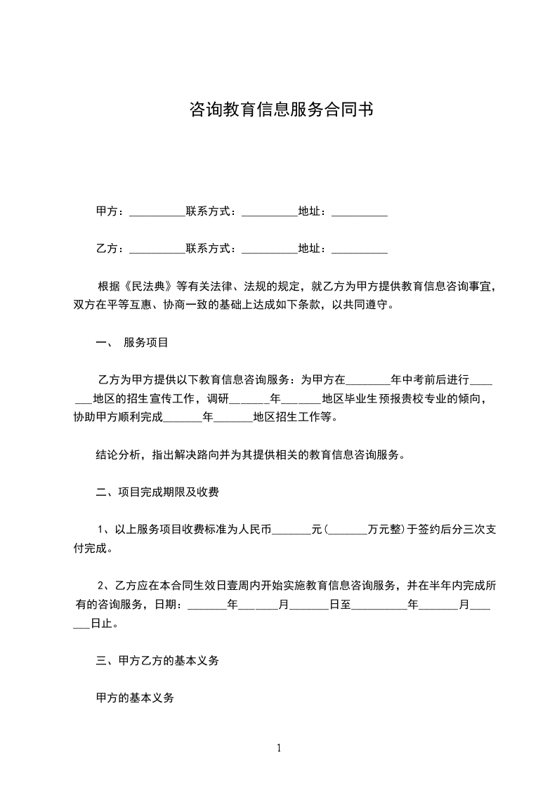 根据《民法典》等有关法律、法规的规定,就乙方为甲方提供教育信息咨询事宜,双方在平等互惠、协商一致的基础上达成如下条款,以共同遵守。