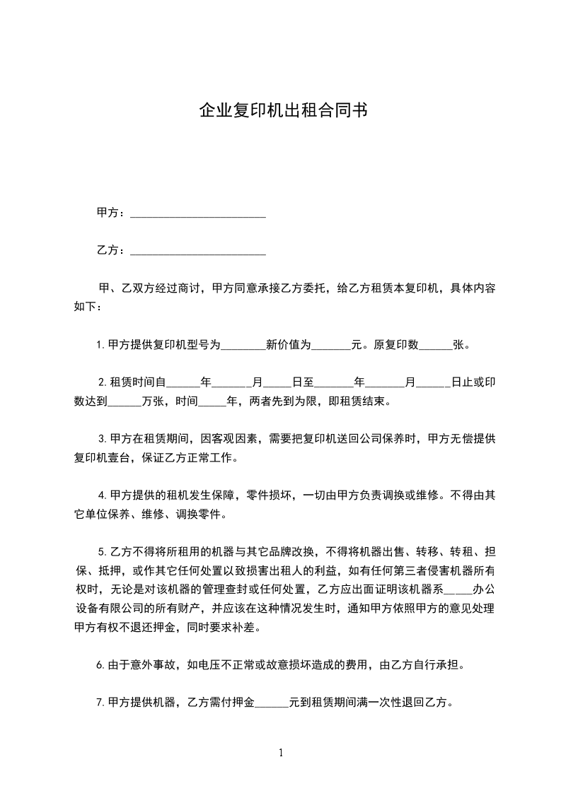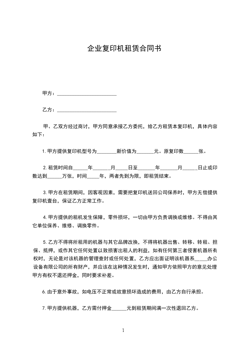 1.甲方提供复印机型号为________新价值为_______元。原复印数______张。