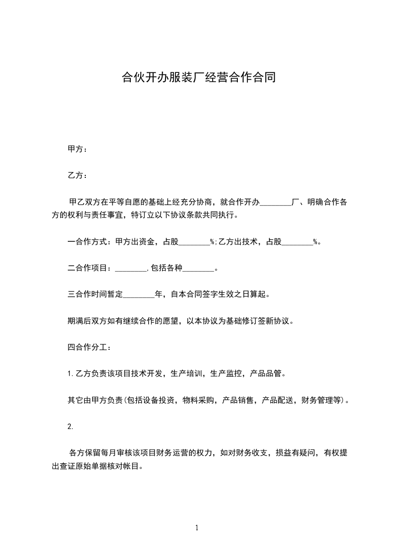 甲乙双方在平等自愿的基础上经充分协商,就合作开办________厂、明确合作各方的权利与责任事宜,特订立以下协议条款共同执行。