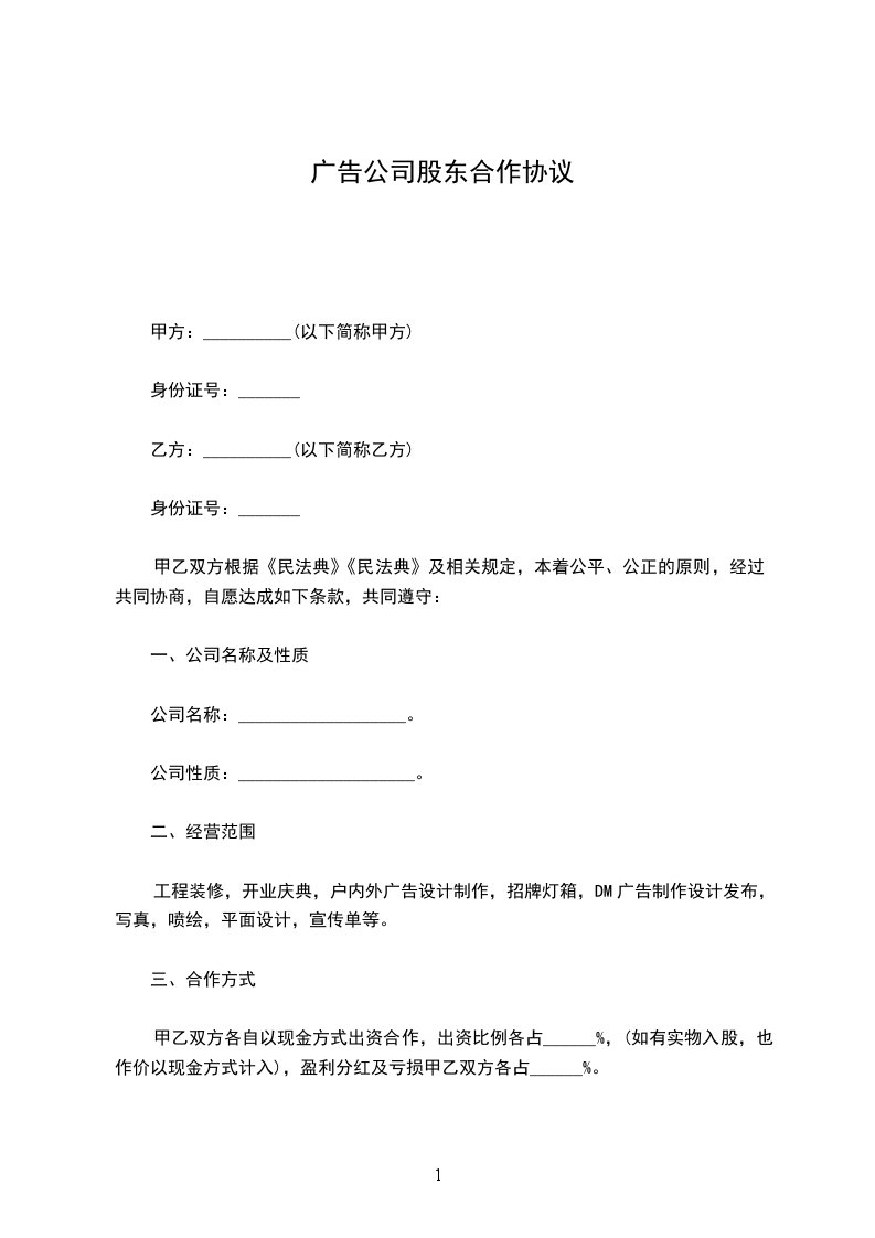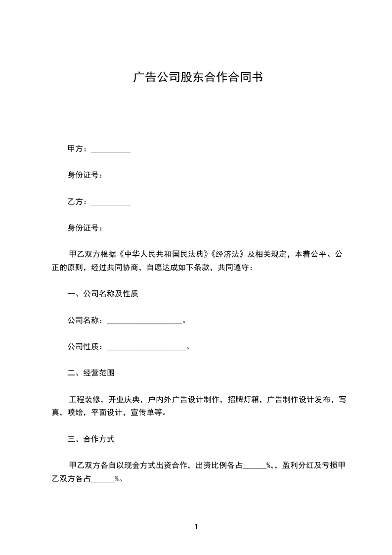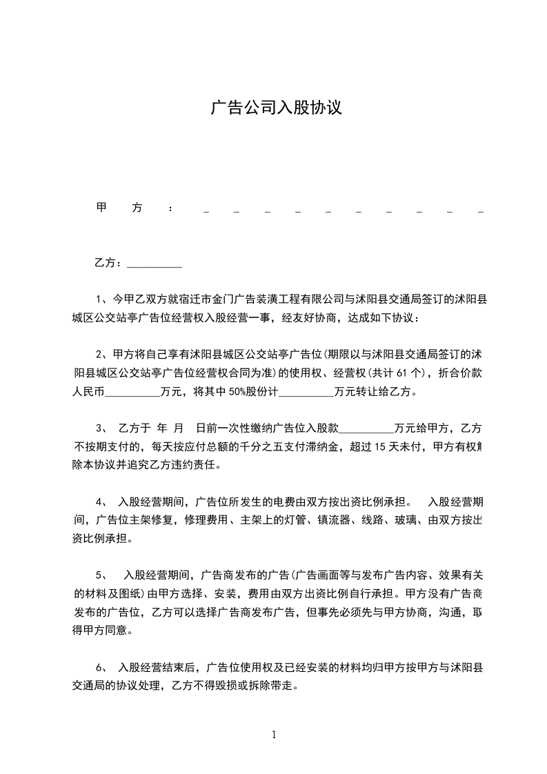 1、今甲乙双方就宿迁市金门广告装潢工程有限公司与沭阳县交通局签订的沭阳县城区公交站亭广告位经营权入股经营一事,经友好协商,达成如下协议: